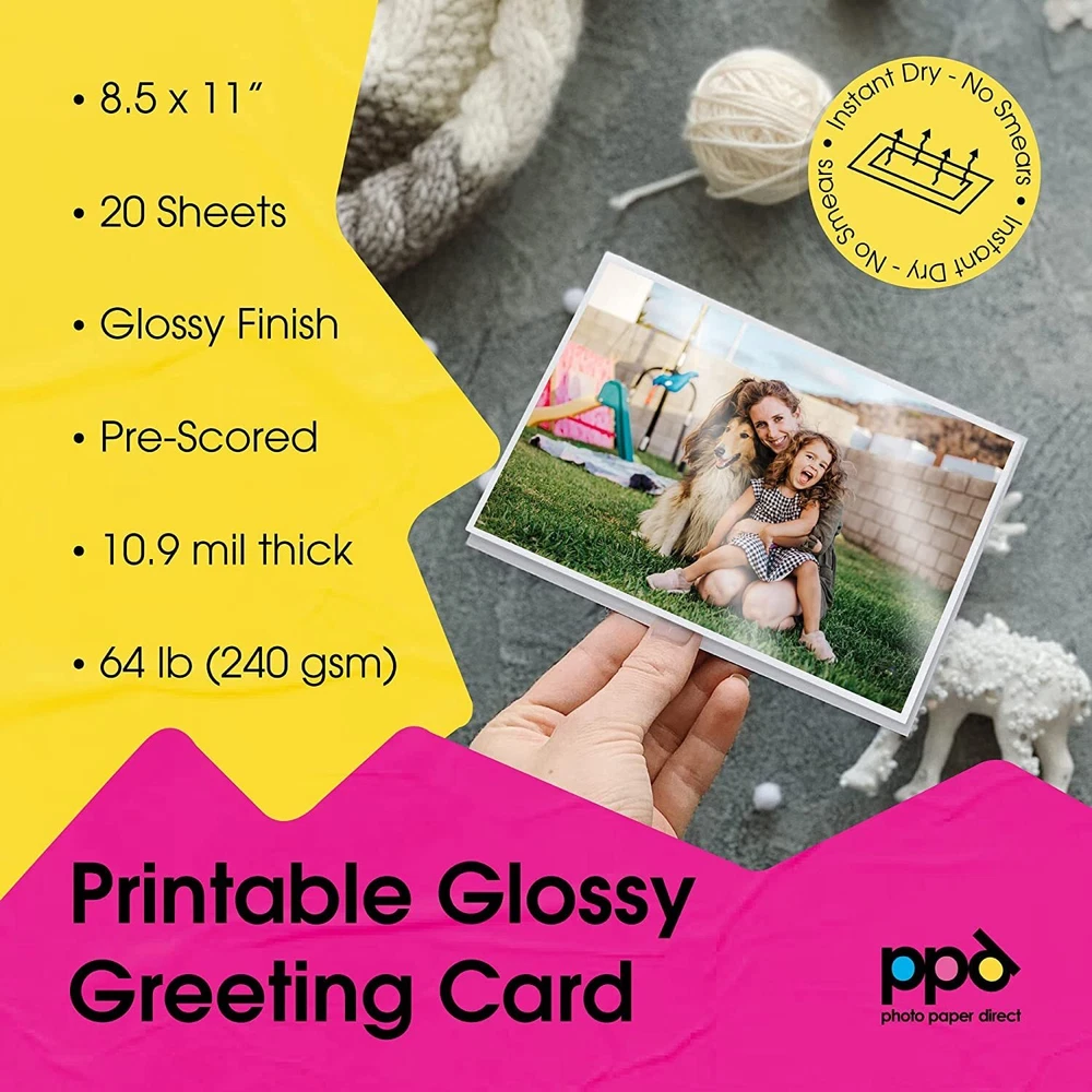 Use this printable greeting card paper / card stock to print your own professional looking greetings cards, christmas cards, thank you notes, invitations, announcements for any occasion, with your own personal creative touches, right from the comfort of your own home. Characteristics: Size - 8.5X11" Weight - 64LBS Finish - Glossy Pack Size - 20 Cards Features: Instant dry - Handle right after printing - no smears! Blank - No watermark or logo on either side. Printable on both sides - Best color gamut and sub tone reproduction (photographic paper quality) on the outside coated side and simple graphics and text in normal quality on the uncoated internal side. Machine Pre-Scored - Easily fold the card in the middle after printing. Compatibility: Printer and Ink - Suitable with all Inkjet printers using every day normal inks. Step-by-step printer settings set-up included in the pack. High-Quality Performance: Our printable greeting cards are crafted from heavyweight 10.9 mil (64 lb/240 gsm) cardstock, offering exceptional durability and a premium feel. Each set includes 20 sheets, providing ample material for all of your projects. The cards feature a glossy finish on the outside for enhanced photographic quality while the matte finish on the inside ensures clean, readable text. Measuring 8.5 x 11 inches, they can be easily folded to 5.5 x 8.5 inches along the prescored line. Versatile for Any Occasion: These blank white greeting cards are perfect for a wide range of events, including birthdays, wedding invitations, and thank you notes. The customizable nature of these cards allows you to add your own photographs and text, making them ideal for creating personalized invitations, heartfelt greeting cards, or stylish thank-you notes. Our versatile card paper accommodates all your creative needs, offering flexibility for any occasion. Easy to Use: Each set comes designed specifically for 5.5 x 8.5 inch note cards. The prescored design of the cards simplifies the folding and assembly process, making it an ideal DIY card project. Whether you're a beginner or an experienced crafter, you'll find this set perfect for creating personalized cards with ease, ensuring a smooth and efficient greeting card making experience. Custom Prints with High-Quality Imagery: The glossy finish on the exterior of these blank white printable cards offers a stunning high color gamut and photographic quality, making your images and designs stand out with vibrant, eye-catching detail. Meanwhile, the matte interior is ideal for clean, readable text and personal messages and greetings offering extreme functionality. Whether you're printing photographs or detailed graphics, these note cards deliver exceptional results. Compatible with All Inkjet Printers: Our greeting card paper is compatible with any inkjet printer, whether you use dye-based or pigment-based inks. The unique design allows you to print on both the glossy exterior and the matte interior, ensuring you can customize both sides. Enjoy consistent, high-quality prints that bring your custom designs and photographs to life. With hassle-free printing, you can achieve reliable, professional results every time, making your greeting cards stand out. Trusted Quality by Photo Paper Direct: Photo Paper Direct has been a leading quality supplier since 1992, known for its commitment to excellence. All products are proudly made in the United Kingdom, ensuring highest standards of quality and craftsmanship. With decades of experience, Photo Paper Direct continues to deliver exceptional products that meet the demands of both professionals and hobbyists alike.