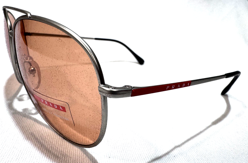 The PRADA SPORT Matte Silver Aviator Sunglasses PS55US - QFP291 are authentic, new eyewear designed for both men and women. These stylish sunglasses feature anti-reflective polycarbonate lenses in rose brown, housed in a matte silver metal frame. With a classic aviator style, these designer sunglasses are perfect for a variety of themes including rock, hippie, retro, and hipster. Made in Italy, these sunglasses have a temple length of 145mm, offering both fashion and functionality for outdoor activities. Size 61-15-145 mm