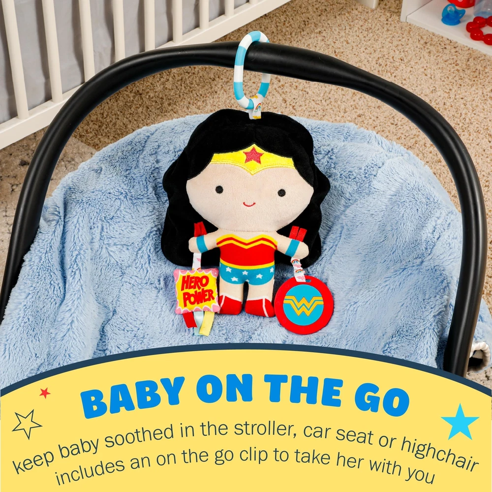 "Wonder Woman™ is the champion of truth and the warrior of peace. As an iconic female pop culture character, Wonder Woman™ has empowered fans for generations and boldly trailblazes a battle for truth through her strength, positivity, and compassion. She fights for those who can’t fight for themselves because she believes in humanity’s potential and its capacity for peace. The Wonder Woman™ Activity Toy measures 11.5 inches including the on the go clip so Wonder Woman can easily go wherever baby wants or needs her most!" Developmental Toy: Help baby learn & grow with an activity toy from DC and Wonder Woman that includes a silicone BPA free teether, rattle, crinkle sounds, and ribbon tabs for sensory development. Soft Teething Toy: Interactive materials keep baby engaged. Soft stuffed plush animal has multiple rings and teethers with fun shapes and textures for chewing and soothing your baby's teeth and gums Baby First Toy: A baby essential, this carseat and stroller toy is ideal for baby showers and new baby welcomes, and is popular for boys & girls ages 0 months to . Lots Of Fun: Ribbons for little fingers, rings to chew, and bright colors keep babies engaged, entertained and soothed. This interactive infant toy delights babies with textures, sounds, & bright colors to discover Modern Classic Baby Toy: Wonder Woman and DC Comics iconic characters are instantly recognizable bringing sweet memories from your own childhood as they help your to learn, play, and grow