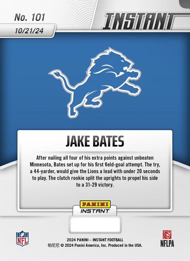 This is a PRESALE. I will ship as soon as I receive it from the manufacturer. YOU WILL RECEIVE A RANDOM serial # out of 99. This is the 1st ever rookie autograph of Jake Bates. This 2024 Panini Instant NFL card features Jake Bates, a rookie player from the Detroit Lions team. The card is autographed with a label or sticker and has a print run of /99. It is a sports trading card with the card number #101, manufactured by Panini and authenticated by Panini Authentic. The autograph format is a label or sticker, and the card belongs to the National Football League (NFL) league. This card is perfect for collectors who love football and want to add a rare and valuable card to their collection. Buy now and add this amazing card to your sports trading card collection!