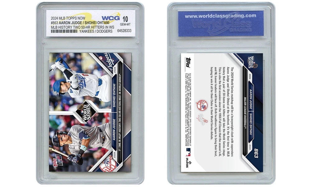 Presale Item: Shipping Details** **This is a PRESALE item, and we expect to ship the cards within approximately 3-4 weeks. Once we receive them from Topps, they will be graded and shipped to you right away. If they arrive earlier, we’ll ship them sooner (they usually ship a little earlier then stated). You are buying this card #863(Judge/Ohtani 50 HR Hitters in World Series - 1st time ever) that will be graded gem-mint 10. Lock in your low price now and buy from a trusted seller! The 2024 World Series will be a heavyweight clash with Superstars Aaron Judge and Shohei Ohtani at the forefront. It's the first time in MLB history that a pair of 50-home run hitters will take the World Series stage. Both headliners are expected to bring their best, hoping to win in their World Series debuts. 2024 MLB Topps Now Aaron Judge / Shohei Ohtani Card #863 1st Time in MLB History Two 50-HR Hitters Meet in World Series - New York Yankees vs. Los Angeles Dodgers - GRADED GEM MINT 10 BRAND-NEW, DIRECT FROM TOPPS! YEAR: 2024 BRAND: TOPPS CARD #: 863 PLAYER: AARON JUDGE / SHOHEI OHTANI SPECIAL: 1st Time in MLB History Two 50-HR Hitters Meet in World Series GRADE: GEM-MINT 10 SIZE: 2.5" x 3.5" - Normal Trading Card Size SKU ARTBB-16C2S-24TN-0863 Printed on 16pt Premium Glossy Trading Card Stock Product Type - Base Card Property - Major League Baseball Baseball Player - AARON JUDGE / SHOHEI OHTANI FREE SHIPPING USA PRESALE - All Cards will be securely mailed with Tracking in about 30-40 days.