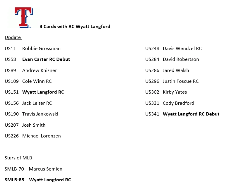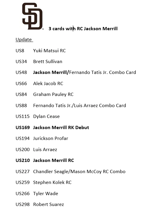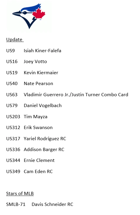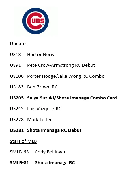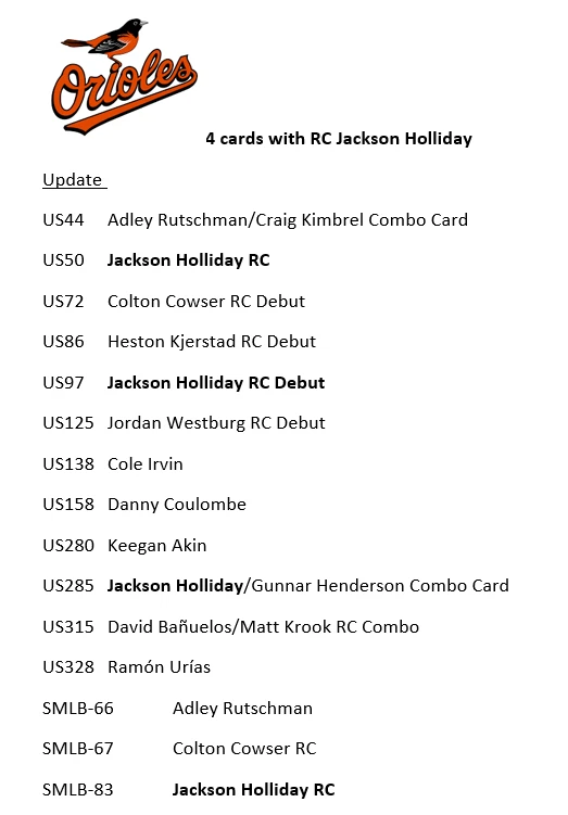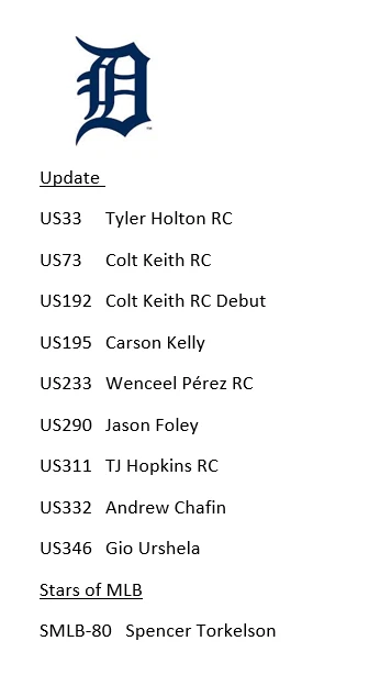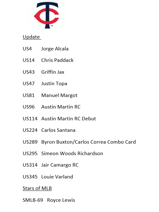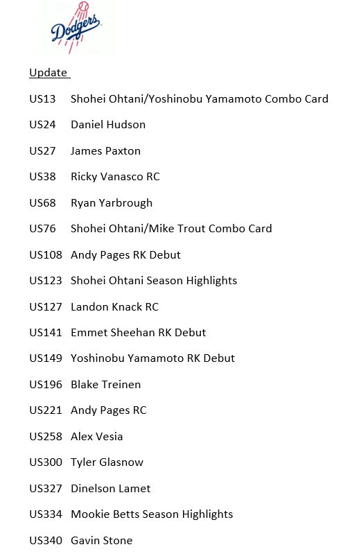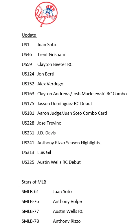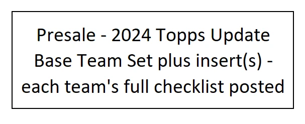 10/30/24 Update - I had some delays with my product and am working to get all orders out. I apologize that it is taking longer. If you have an urgent need for your item, please reach out, also if you need to cancel the order, I totally understand and again apologize. Thank you very much for your patience and orders. This is a presale for 2024 Update Team Sets. You will get all the base cards for that team in the update series plus random Stars of MLB inserts and/or other inserts for players on that particular team. Update releases mid-late October and I will need a little to put these together but will get these out as soon as I can. I ship in order of purchase so those who ordered earlier will get them sooner. Don't worry about an expected ship date that is far into November or December, they will ship before that. Team checklists have been updated based on Topps website for all teams (Subject to Change) - Phillies only have 4 cards in Update so would recommend getting full team set from my other listing which includes Series 1 & 2 if you want the Phillies. Update includes multiple rookie cards of Paul Skenes (Pitt), Jackson Holliday (Bal), Wyatt Langford (Tex), Jackson Chourio (Mil), Jackson Merrill (SD), and many others. 1 team set ships Ebay Std Envelope, 2 or more ship USPS Ground Advantage. If you are buying more than 3, please request an invoice so I can adjust shipping costs appropriately. If you have already purchased more than 3 at a time, I will refund some of your shipping charges when I ship.