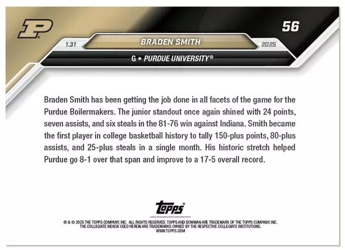 PRESALE 2024-25 Bowman U Now Braden Smith Dazzling Performance Historic #59 Estimated to ship around Early March