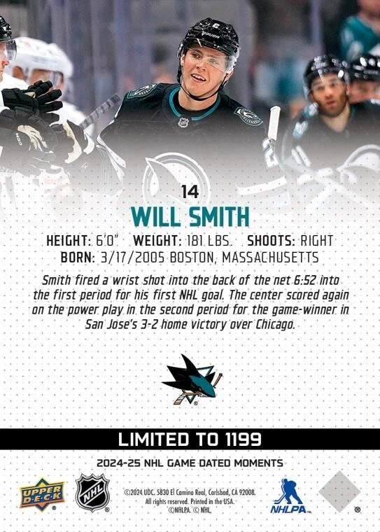 #14 (Oct. 31, 2024) - Will Smith Scores First NHL Goal to Open the Scoring in the First Period of San Jose's Victory over Chicago This is a PRESALE PLEASE ALLOW 8-12 weeks for delivery, based on availability from Upper Deck. This listing is for the physical card to be mailed to you. ***Card can be transferred on Epack after being REDEEMED with no shipping cost*** Will combine shipping if interested in others! *** All shipping is $4.50 USD. Canadian/International shipping is done through Ebay's International shipping program. I have no control over the associated costs with this.***