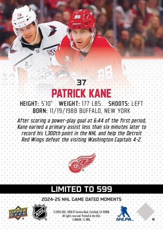 #37 (Dec. 29, 2024) - Patrick Kane Reaches 1,300 NHL Points with Two-Point Performance in Red Wings' 4-2 Home Victory Over Capitals This is a PRESALE PLEASE ALLOW 8-12 weeks for delivery, based on availability from Upper Deck. This listing is for the physical card will be mailed to you. ***Card can be transferred on Epack after being REDEEMED with no shipping cost*** Will combine shipping if interested in others! *** All shipping is $4.50 USD. Canadian/International shipping is done through Ebays International shipping program. I have no control over the associated costs with this.***