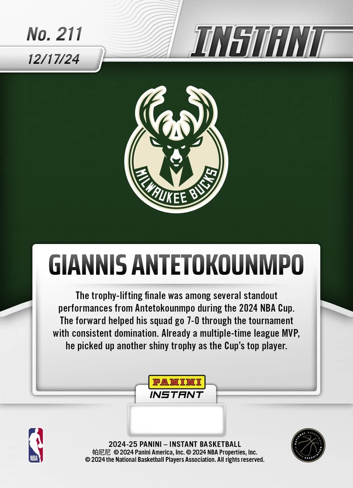 Please note: This is currently a PRESALE listing. There is an extended wait time for this card to ship as it is still awaiting printing. The Short Description: About this card: PRESALE: Giannis Antetokounmpo NBA Cup MVP 2024-25 Panini Instant NBA 211 - Base What's special about this card: NBA No. 211 12/17/24 GIANNIS ANTETOKOUNMPO The trophy-lifting finale was among several standout performances from Antetokounmpo during the 2024 NBA Cup. The forward helped his squad go 7-0 through the tournament with consistent domination. Already a multiple-time league MVP, he picked up another shiny trophy as the Cup's top player. If you are someone who wants to collect every single card for a particular person, then this card is definitely for you! Rarity/Quantity Produced: Only (Unknown - still in presale) of this card were created. No more will be made. Availability: PRESALE . We are awaiting inventory from Panini. Card Condition: New/Direct from Manufacturer and shipped to us, then shipped to you. Stock photos shown. Shipping: Via envelope. See below for more details. $1.29 for the first item, $.79 each additional. The Long Description (please read) : Card Packaging and Condition: "Base" Cards: Comes from Panini in a Penny Sleeve and Rigid Top Loader. I will repackage it in a semi-rigid top loader for envelope shipping. If you want the rigid loader instead, you need to upgrade and pay for Ground Advantage shipping. All other cards come packaged directly from Panini in a Penny Sleeve, inside a Rigid Top Loader, with a tamper-proof Panini sticker on top. Since these are rigid, I will ship them Ground Advantage and appropriate shipping charges will apply. See item photo for more details. Potential PSA Grading : While all cards are brand new from Panini, this does not necessarily guarantee a PSA 10 card. It should most often be the case as it is coming packaged directly from the manufacturer. We will not ship cards with obvious major flaws. Our research into PSA graded Panini Instant cards has revealed that approximately: 65% of cards grade PSA 10 30% of cards grade PSA 9 5% of cards grade PSA 8 or lower Our feeling on this is that some people may have broken the Panini seal and improperly handled the card before sending it to PSA, thus reducing the grade received. What is Panini Instant? Panini Instant Cards - Celebrate Iconic Moments with Limited-Edition Collectibles! Panini Instant Cards are exclusive, limited-edition trading cards that commemorate unforgettable moments in sports and entertainment. These cards are released shortly after a memorable event, allowing collectors to own a tangible piece of history. Each card is crafted with premium materials and comes in a variety of stunning designs and rarity levels. Every card is only available in a strictly limited quantity, making them highly desirable for collectors. Here's your chance to own a card that represents a special moment! Available Types of Cards & Rarities: Each Panini Instant Card features unique designs and comes in limited quantities. Here's a breakdown of the types available: Base: Standard design capturing iconic moments; limited to the number of cards ordered within the narrow timeframe they are available for sale . Cards will indicate 1 of #, for example, 1 of 532. The individual number in the series is not displayed. All cards will state "1 of ###" The lower the number, the rarer it is. Parallel Designs - The same photo as the base card, but with design variations referenced below: Blue Viper: Stunning blue-patterned viper design; a truly unique card with only 1 card ever created . Card will indicate "One of One." Versicolor: Unique multi-colored finish; limited to only 5 cards ever created . Card will indicate the individual number in the series, for example, 3/5. White Tiger: Striking white tiger-striped pattern; limited to only 5 cards ever created . Card will indicate the individual number in the series, for example, 3/5. Jaguar: Sleek and fierce spotted design; limited to only 10 cards ever created . Card will indicate the individual number in the series, for example, 3/10. Auto : Autographed, along with one of the options above. For example, a "Jaguar Auto" card would be an Autographed Jaguar design card, limited to 10 cards. Panini directly authenticates and guarantees the autographs. Shipping: "Base" cards ship in an eBay approved standard envelope. Each card will be in a penny sleeve, inside a semi-rigid top loader, taped at the top for security, held in place on a sheet of paper with tape to prevent shifting, with a sheet of cardboard inserted in the envelope. Each eBay standard envelope shipment includes a $20 shipping protection plan on a single order, and up to $50 on combined orders to help in case of lost or damaged items. All other cards will ship in a penny sleeve, inside a Rigid top loader, taped at the top for security, held in place on a sheet of paper with tape to prevent shifting, with a sheet of cardboard inserted in the envelope. Ground Advantage rates apply.