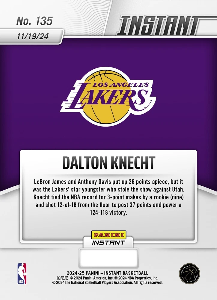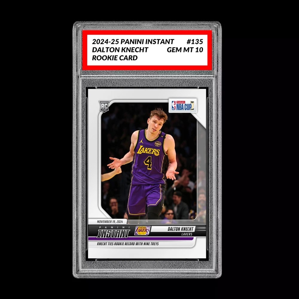 This rare and limited edition trading card features Dalton Knecht, a rising star in the National Basketball Association (NBA). The card is part of the 2024-2025 Panini Instant set and is an original, not a reprint. It is a single card with the card number 135, manufactured by Panini in 2020. The card celebrates Knecht's rookie season with the Los Angeles Lakers and is a must-have for any NBA fan or collector. It is a special edition card with features that include Knecht's rookie status and his team's victory in the NBA Finals. Don't miss out on the chance to add this valuable and unique card to your collection. If this is a PRESALE those cards will ship ASAP according to eBay Policy. Professionally graded by GM10 Grading located in Gettysburg PA, Owned and Operated by Tempus Media LLC, this ensures card authenticity and top-notch quality. These cards are sonically welded and sealed in an acrylic graded card case. Very similar to what the major grading companies use. If you want a big name grading company this isn’t for you. These are not graded by one of the top professional grading companies but a local professional card company. These are 100% authentic cards graded and displayed in a clean professional looking case at discounted price. If you’re not happy with your purchase please let us know and we will send you a prepaid return label. We have sold thousands of similar graded cards and our customers reviews have been awesome. Our collectors love ❤️ our service. You’ll love the clean professional look at the discounted price. If this is a PRESALE those cards will ship ASAP according to eBay Policy. Thank you for supporting small business in the USA!