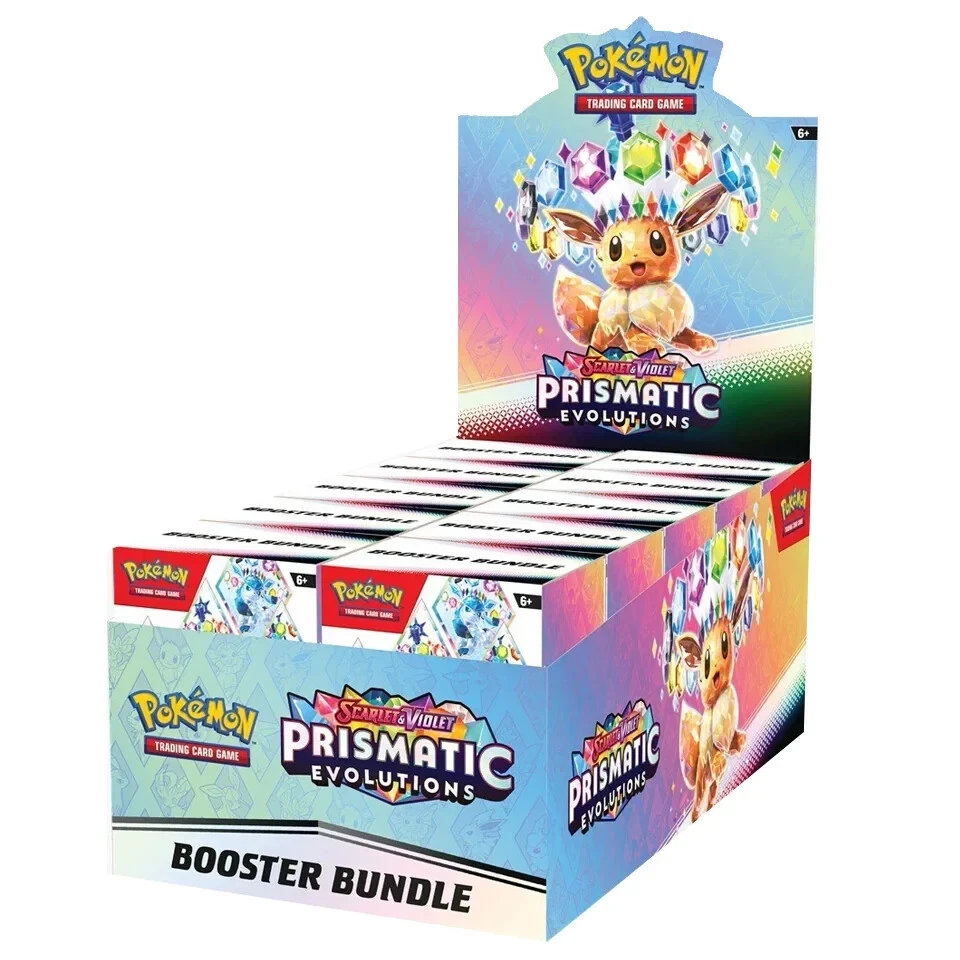 *** Does not include display *** This is a presale for x10 Booster Bundles of Prismatic Evolutions. This product is set to release on March 7th, 2025 and will be shipped as soon as the product is in hand (Estimated to ship 03/2025). All sales are final and will not be cancelled or refunded for any reason, if you have any questions, please send me a message before purchasing so that any questions or concerns can be addressed before you decide to purchase the booster bundles. Pokemon TCG Product Description: Eevee & Friends Light Up with Stellar Colors! From fluffy and fiery to freezing and fanciful, Eevee and its many Evolutions hold a special place in the hearts of Pokémon Trainers across the land! Discover their unique new powers as Stellar Tera Pokémon ex, and look for treasure of your very own across a grand gathering of Pokémon ex from Paldea and beyond. Glittering gems and hidden patterns await at the end of the rainbow in the Pokémon TCG: Scarlet & Violet—Prismatic Evolutions expansion! Includes six booster packs from the Pokémon TCG: Scarlet & Violet—Prismatic Evolutions expansion Each booster pack contains 10 cards and 1 Basic Energy. Cards vary by pack.
