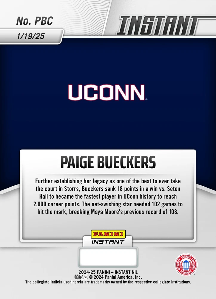 Volume Pricing : Buy 2-3: Small discount. Buy 4+: 20% off! Presale Event ! We’re securing inventory from Panini. Printing & shipping may take 4–8 weeks , expected ship date as late as 3/27/2025 . Buy now—prices will increase when Panini ends sale! Shipping : $1.29 first item, $0.79 each additional. Max. $6. Shipped in an eBay approved standard envelope. About this card: MILESTONE - JANUARY 19, 2025 - BUECKERS BECOMES FASTEST HUSKY TO 2K POINTS What's special about this card: No. PBC 1/19/25 Further establishing her legacy as one of the best to ever take the court in Storrs, Bueckers sank 18 points in a win vs. Seton Hall to became the fastest player in UConn history to reach 2,000 career points. The net-swishing star needed 102 games to hit the mark, breaking Maya Moore's previous record of 108. Record-Breaking Performance : Bueckers became the fastest UConn women's basketball player to reach 2,000 career points , achieving this milestone in 102 games (breaking Maya Moore’s previous record of 108 games). Game Highlight : She scored 18 points in a win against Seton Hall on January 19, 2025. Card Details : Part of Panini’s NIL (Name, Image, Likeness) collection, licensed to feature collegiate athletes under NCAA policies. Legacy Note : The card emphasizes her growing legacy as one of UConn’s all-time greats, alongside legends like Maya Moore. Rarity/Quantity Produced : Only (Unknown - still in presale) of this card were created. No more will be printed. Availability : PRESALE. We are awaiting inventory from Panini. Card Condition : New/Direct from Manufacturer and shipped to us, then shipped to you. Stock photos shown. " Base " Cards: Comes from Panini in a Penny Sleeve and Rigid Top Loader, with tape on top. What is Panini Instant? Panini Instant Cards - Celebrate Iconic Moments with Limited-Edition Collectibles! Panini Instant Cards are exclusive, limited-edition trading cards that commemorate unforgettable moments in sports and entertainment. These cards are released shortly after a memorable event, allowing collectors to own a tangible piece of history. Each card is crafted with premium materials and comes in a variety of stunning designs and rarity levels. Every card is only available in a strictly limited quantity, making them highly desirable for collectors. Here's your chance to own a card that represents a special moment! Available Types of Cards & Rarities : Each Panini Instant Card features unique designs and comes in limited quantities. Here's a breakdown of the types available: Base : Standard design capturing iconic moments; limited to the number of cards ordered within the narrow timeframe they are available for sale. Cards will indicate 1 of #, for example, 1 of 532. The individual number in the series is not displayed. All cards will state "1 of ###" The lower the number, the rarer it is. Parallel Designs - The same photo as the base card, but with design variations referenced below: Blue Viper : Stunning blue-patterned viper design; a truly unique card with only 1 card ever created. Card will indicate "One of One." Versicolor : Unique multi-colored finish; limited to only 5 cards ever created. Card will indicate the individual number in the series, for example, 3/5. White Tiger : Striking white tiger-striped pattern; limited to only 5 cards ever created. Card will indicate the individual number in the series, for example, 3/5. Jaguar : Sleek and fierce spotted design; limited to only 10 cards ever created. Card will indicate the individual number in the series, for example, 3/10. Auto : Autographed, along with one of the options above. For example, a "Jaguar Auto" card would be an Autographed Jaguar design card, limited to 10 cards. Panini directly authenticates and guarantees the autographs.