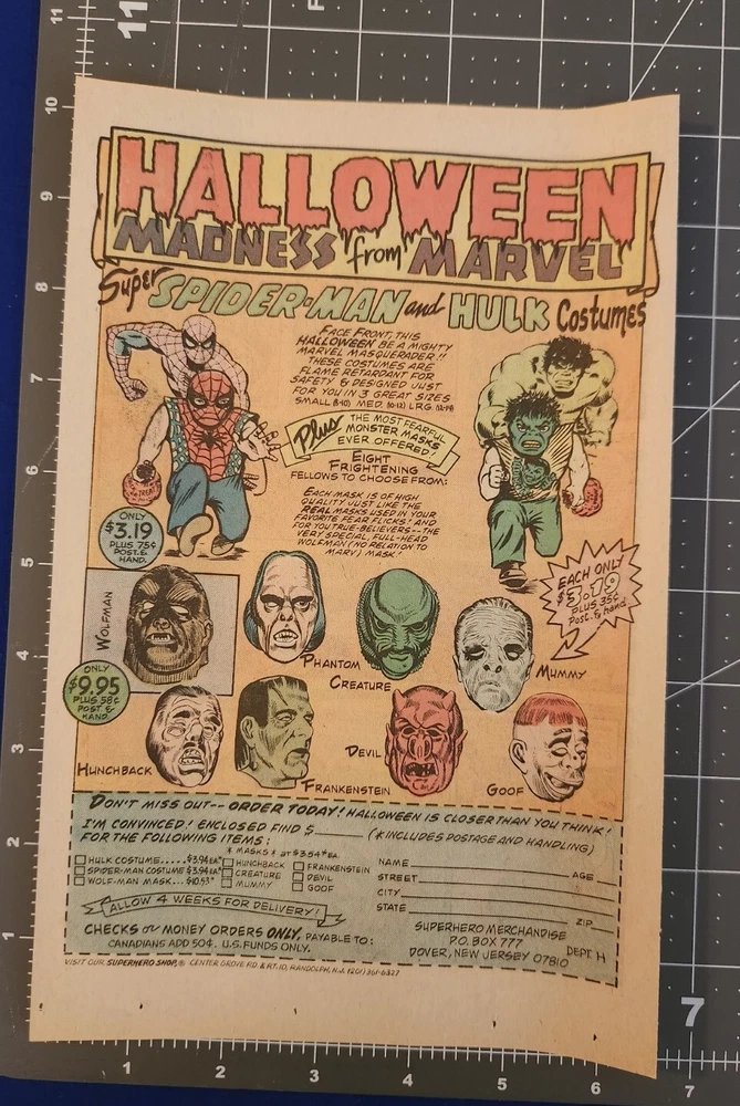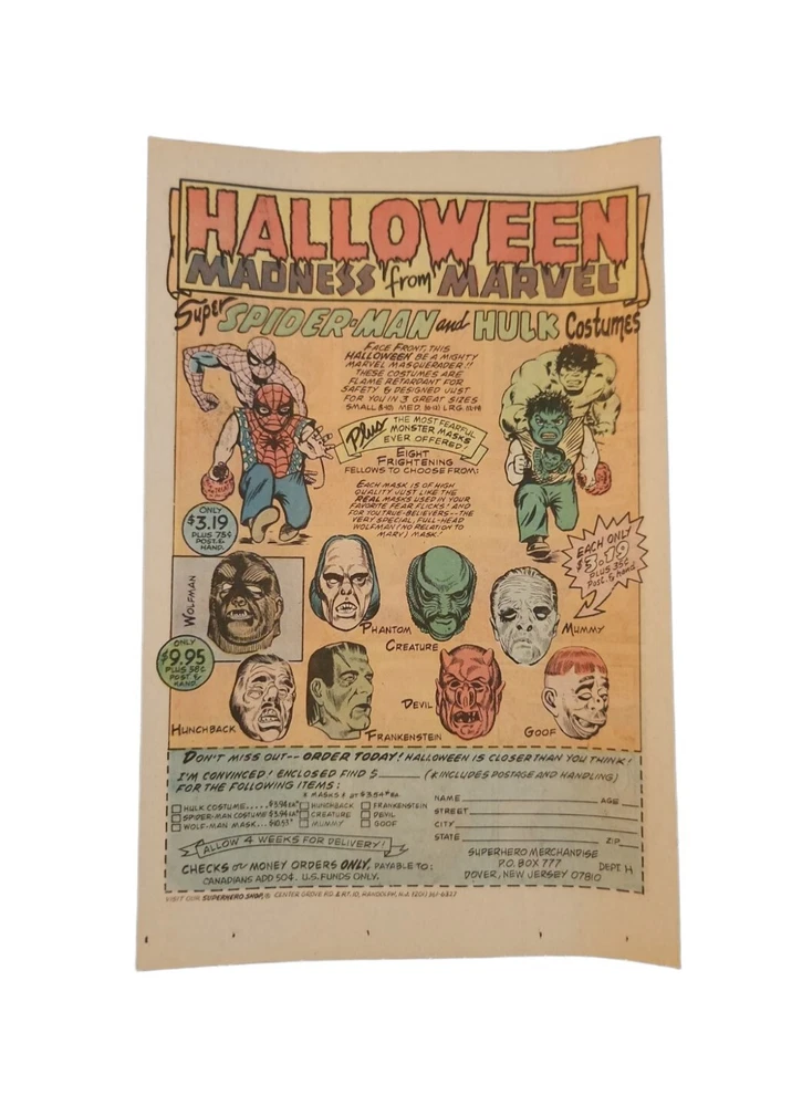 Perfect for framing! Vintage 1976 MARVEL HALLOWEEN COSTUMES Print Ad. The Incredible Hulk, Spider-man, Wolfman, Frankenstein Order form. This advertisement is an original advertisement and not a reproduction. It measures Approximately 10.25 x 6.75 inches. It will be stored and shipped in a plastic sleeve with a backing board