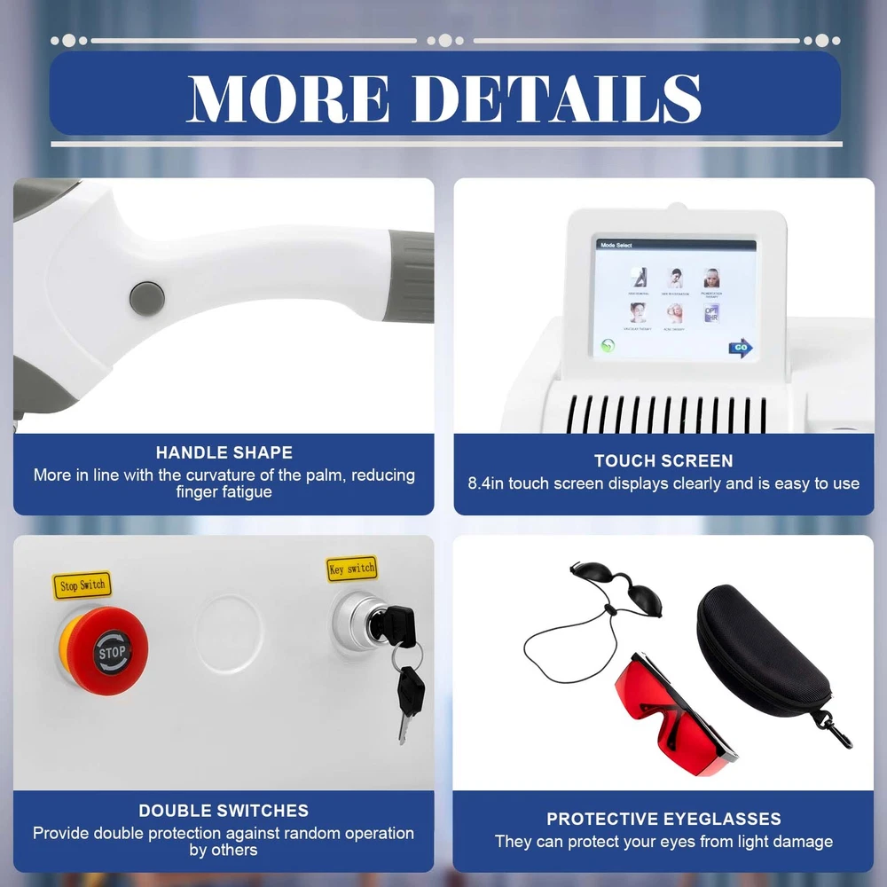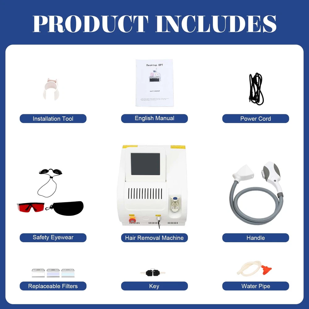 Specification Material: ABS Feature: Acne Treatment, Hair Removal, Skin Tightening, Remove Freckles, Improve Telangiectasia, Improve Dull Skin Display: 8.4in Touch Screen Treatment Handle: 1 Handle Integrated Skin Cooling: -4 Degree ~ +10 Degree Wavelength: 480nm/530nm/640nm Output Power: 2000W Spot Size: 15*50mm/0.59*1.97in Frequency: up to 10Hz IPL Energy: 1-50J/cm² Voltage: 110V 60Hz Handle Pipe Length: 1.5m/4.92ft Handle Size: 29*11.4*3.5cm/11.42*4.49*1.38in Screen Size: 22.3*19.7*3.3cm/8.78*7.76*1.3in Product Size: 38.5*52*27cm/15.16*20.47*10.63in Package Size: 60*47*43cm/23.62*18.5*16.93in Storage Box Size: 59.3*45.3*41cm/23.35*17.83*16.14in Net Weight: 11.4kg/25.13lbs Gross Weight: 18.55kg/40.9lbs PRO OPT Elight IPL Laser Hair Removal RF Skin Rejuvenation Machine Permanent NEW Description In the beauty industry, with the continuous advancement of technology, hair removal technology is constantly innovated. In recent years, the technology of IPL (Intense Pulsed Light) and bipolar radio frequency have become popular choices in this field. Today, an excellent hair removal machine combines IPL and bipolar RF to stimulate collagen at different depths to rearrange and grow, leading to better treatment results. Key Features Fast Treatment: Adopted reasonable frequency (up to 10Hz) and large spot size (15*50mm), the hair removal machine ensures high-efficient operation to treat and remove hair quickly. Multiple Functions: This beauty machine features different filters including 480nm for acne treatment, 530nm for pigmentation and spot removal, and 640nm for hair removal. It is versatile and can meet your different needs. Painless Experience: With an effective air and water cooling system, and copper radiator, the machine has an adjustable contact temperature from 24.8℉ to 50℉, making hair removal more comfortable and painless . Professional Technology: Applied with IPL and bipolar RF , the machine can better remove pathological tissue without damaging the epidermis so as to stimulate the production of collagen, making the skin firmer and more elastic. Long-lasting Effect: It delivers long-lasting hair removal results, usually with only 3-5 times to achieve significant hair reduction. This not only saves you the trouble of frequent hair removal, but also gives you more confident skin. Safe to Use: The machine can adjust the energy output according to different skin tones and hair colors. Besides, it has a checking system of water temperature to ensure the safe operation of the machine. Easy to Operate: This removal machine is equipped with an intuitive smart touch screen that makes operation easy and convenient. Users can choose different modes according to their needs. Excellent Customer Service: If you have any questions about it, please feel free to contact us. We will do our best to solve it for you until you are satisfied. Details Handle Shape: The shape of the handle is more in line with the curvature of the palm, reducing finger fatigue. Key and Stop Switch: They provide double protection against random operation by others. Protective Eyeglasses: It protects your eyes from light damage. Application This hair removal machine is widely used to remove excess hair from the body, including the legs, underarms, chest and arms. It is ideal for people with different skin tones and hair colors in the spa, skin management center, skin beauty office, and home use. Specification Material: ABS Feature: Acne Treatment, Hair Removal, Skin Tightening, Remove Freckles, Improve Telangiectasia, Improve Dull Skin Display: 8.4in Touch Screen Treatment Handle: 1 Handle Integrated Skin Cooling: -4 Degree ~ +10 Degree Wavelength: 480nm/530nm/640nm Output Power: 2000W Spot Size: 15*50mm/0.59*1.97in Frequency: up to 10Hz IPL Energy: 1-50J/cm² Voltage: 110V 60Hz Handle Pipe Length: 1.5m/4.92ft Handle Size: 29*11.4*3.5cm/11.42*4.49*1.38in Screen Size: 22.3*19.7*3.3cm/8.78*7.76*1.3in Product Size: 38.5*52*27cm/15.16*20.47*10.63in Package Size: 60*47*43cm/23.62*18.5*16.93in Storage Box Size: 59.3*45.3*41cm/23.35*17.83*16.14in Net Weight: 11.4kg/25.13lbs Gross Weight: 18.55kg/40.9lbs Package Included 1* Hair Removal Machine 1* Handle 1* Power Cord 1* Water Pipe 2* Protective Glasses 2* Keys 3* Replaceable Filters 1* English Manual All Accessories for Installation Notes Please note that after receiving the machine, it must be filled with water before turning on the power. Please allow the slight color difference caused by the shooting light and 1-3cm error due to manual measurement, and make sure you do not mind before ordering. Product Introduction: Applying the technique of IPL and Bi-polar Radio Frequency, the equipment acts on the entire skin corium and connective tissue, stimulates the collagens of different depth to realign and grow, then gets treatment effect. Bio-polar RF release energy at the same time, with the selective absorption for the skin to light energy, various pathological tissues of corium and epidermis creates Photothermolysis effect. Since light energy is far below conventional IPL, the pigment tissue and vascular pathological tissue of the corium and epidermis would absorb more energy without injuring the epidermis, and then remove these pathological tissues better and get the effect. IpL machine with different sapphire filters 530nm for pigmentation and spot removal 640nm for hair removal Specification Feature: Acne Treatment, Hair Removal, Skin Tightening Wavelength:480nm/530nm/640nm Output Power: 2000W Spectrum Area:480-640nm Spot Size:15*50mm Treatment Handle:1 handle IPL Energy:1-50J/cm2 Display:8.4 inch Touch Screen Intergrated skin cooling :-4 degree ~ +10 degree Voltage:110V 60Hz Size: 38*53*27cm/14.96"*20.86"*10.62" Net Weight: 19kg Gross Weight: 22kg Package Size: 61*48*45cm Advantage 1) Cost effective: One hand piece with interchangeable filters for different treatments. 2) High-efficiency: Large spot size 15*50mm ensures high-efficient operation. 3) Fast treatment. Frequenc