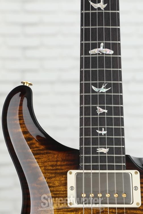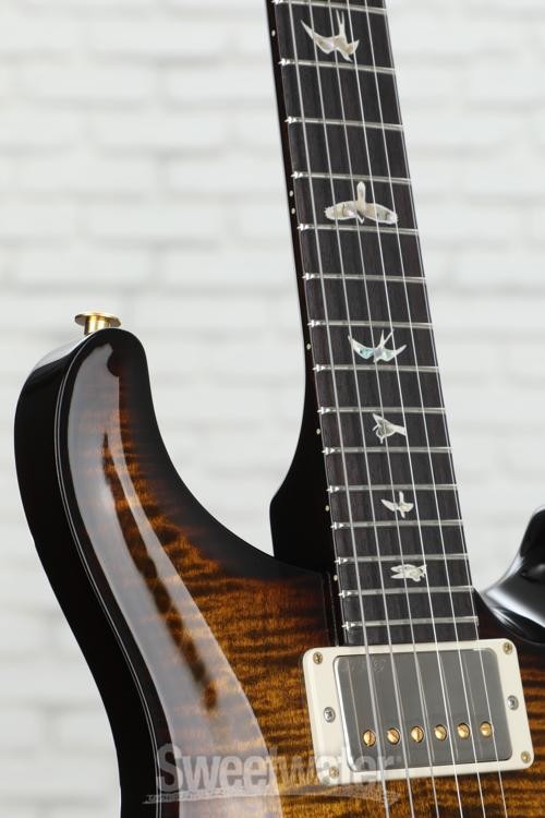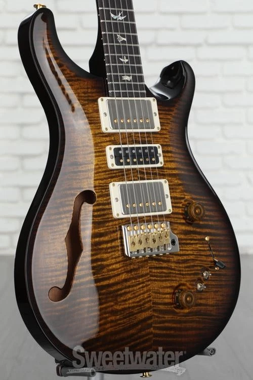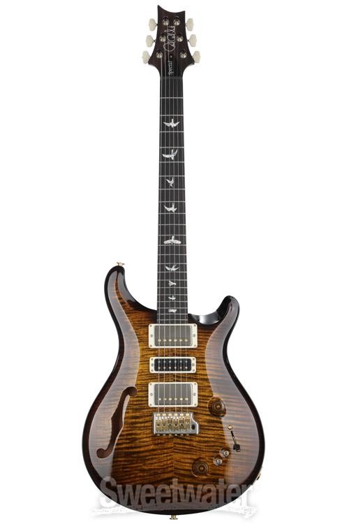 This PRS Semi-Hollow Does It All The PRS Special Semi-Hollow is an irresistible package for the tone-savvy guitarist who demands the ultimate in playability and sonic versatility. It all starts with a resonant chambered mahogany body and a gorgeous carved maple 10-Top graced with a single F-hole. The Special Semi-Hollow is fitted with a trio of high-performance PRS pickups and flexible switching that provides instant control over a formidable tone arsenal — giving you a total of 12 pickup combinations that will cover any genre, from classic rock to edgy fusion. And of course, being a PRS, the playability is flawless. If you’re looking for one guitar that does it all, Sweetwater’s guitar gurus suggest giving the PRS Special Semi-Hollow a serious audition.A sonic arsenal under your command The PRS Special Semi-Hollow is all about tonal dexterity, thanks to its complement of proprietary PRS pickups and versatile switching scheme. Stationed Sweetwater is an Authorized PRS Dealer Genuine New Item Sweetwater's 2-year warranty and 55 point inspection PRS Special Semi-Hollow 10-Top Electric Guitar - Black Gold Wraparound Burst Semi-hollowbody Electric Guitar with Mahogany Body, Maple Top, Mahogany Neck, Rosewood Fingerboard, and 3 Humbucking Pickups - Black Gold Wraparound Burst This PRS Semi-Hollow Does It All The PRS Special Semi-Hollow is an irresistible package for the tone-savvy guitarist who demands the ultimate in playability and sonic versatility. It all starts with a resonant chambered mahogany body and a gorgeous carved maple 10-Top graced with a single F-hole. The Special Semi-Hollow is fitted with a trio of high-performance PRS pickups and flexible switching that provides instant control over a formidable tone arsenal — giving you a total of 12 pickup combinations that will cover any genre, from classic rock to edgy fusion. And of course, being a PRS, the playability is flawless. If you’re looking for one guitar that does it all, Sweetwater’s guitar gurus suggest giving the PRS Special Semi-Hollow a serious audition. A sonic arsenal under your command The PRS Special Semi-Hollow is all about tonal dexterity, thanks to its complement of proprietary PRS pickups and versatile switching scheme. Stationed at the bridge and neck are 58/15 LTs, which produce a rich, organic vintage tone. This is the warm and clear sonic elixir that propelled the original 58/15 pickups to the top of many guitarists’ favorite PAF-style humbucker lists. The 58/15 LT is based on that successful design, but it’s wound with fewer wire turns for even more clarity and nuance. Cranked through a good tube amp, the 58/15 LT can produce raging overdrive with fat, snarling tone that nevertheless maintains crystalline note separation within chords. PRS’s Narrowfield, deployed in the middle position of the Special Semi-Hollow, is a remarkable pickup that delivers the best characteristics of a humbucker, a P-90, a traditional single-coil, and a mini humbucker. Technically, the Narrowfield’s dual coils classify it as a humbucking design, while its svelte form factor is reminiscent of a mini humbucker (with which, perhaps not surprisingly, it shares certain tonal characteristics). Mini humbuckers have long been prized for their ability to maintain clarity in overdrive conditions while bucking the hum. The Special Semi-Hollow is equipped with two mini-toggle switches that split the pickup coils for sparkly single-coil tones, while a 5-way pickup selector switch serves up spanky reverse-polarity tones in positions 2 and 4. The immense flexibility of the Special Semi-Hollow’s unique pickup and switching arrangement gives you an instrument that can serve up any electric guitar sound you could ever need for a live gig or a special studio session. Pattern profile neck for optimized playability The PRS Special Semi-Hollow is spec’d with PRS’s Pattern profile neck. A hallmark of PRS quality, neck shapes are, of course, critical to your playing experience. Perfected after years of prototyping, the Pattern neck is an updated Wide Fat PRS neck style based on neck shapes Paul Reed Smith designed in the 1970s and 1980s for Carlos Santana, Peter Frampton, and Howard Leese of Heart. Fast and comfortable, the Pattern profile always feels just right. In reality, most electric guitarists employ a combination of thumb-over and thumb-behind fretting-hand positions in their playing, and the Pattern profile lets you switch seamlessly between the two. PRS Special Semi-Hollow Features: Chambered mahogany body; flame maple 10-Top Mahogany neck, Pattern profile 22-fret rosewood fingerboard with Bird inlays Neck pickup: 58/15 LT Middle pickup: Narrowfield Bridge pickup: 58/15 LT 5-way blade pickup selector Master volume and Tone controls 2 mini-toggle coil-split switches PRS Gen III Tremolo vibrato bridge Designed and crafted by PRS luthiers in Maryland, USA Specification Detail Number of Strings 6 Left-/Right-handed Right-handed Body Type Semi-hollowbody Body Shape Special Semi-Hollow Body Material Mahogany Top Material 10-Top Maple Color Black Gold Wraparound Burst Body Finish Gloss Nitrocellulose Lacquer Neck Material Mahogany Neck Shape Pattern Neck Joint Set Neck Radius 10" Fingerboard Material Rosewood Fingerboard Inlay Birds Number of Frets 22, Nickel Scale Length 25" Nut Width 1.687" Nut Material PRS Proprietary Bridge/Tailpiece PRS Patented Tremolo, Gen III Tuners PRS Phase III Locking, 18:1 Neck Pickup PRS 58/15 LT Humbucker Middle Pickup PRS Narrowfield Humbucker Bridge Pickup PRS 58/15 LT Humbucker Controls 1 x volume, 1 x tone Switching 5-way blade pickup switch, 2 x mini-toggle (coil split) Strings PRS Signature, .010-.046 Case/Gig Bag Hardshell Case RETURN INFORMATION We want you to be completely happy with your purchase from Sweetwater. If you are not satisfied with your product, you may return it for a refund of the purchase price within 30 days. If your purchase was eligible for Free Shipping, the shipping c