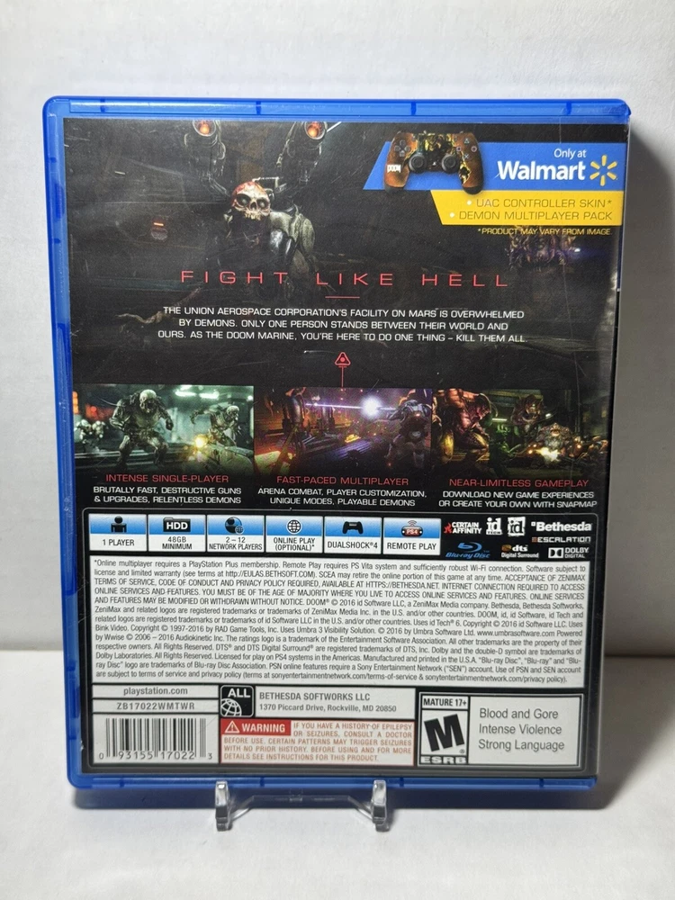 Video Game Series:DoomRelease Year:2016Rating:M - MaturePublisher:BethesdaPlatform:Sony PlayStation 4Features:MultiplayerGenre:ShooterMPN:CUSA02085Game Name:DoomRegion Code:NTSC-U/C (US/Canada)
