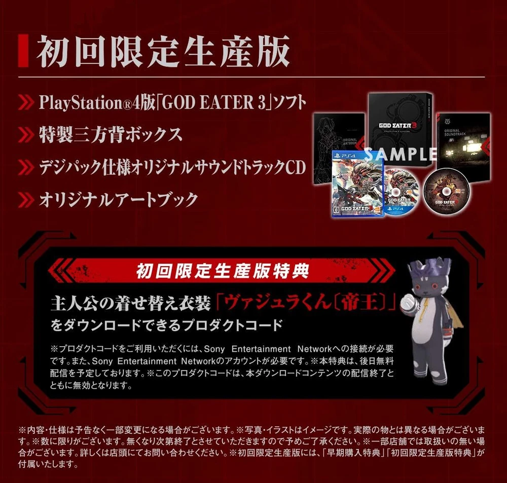 Thank you for visiting our page c18i8td8z4Used.VeryGood Detail [PS4] GOD EATER 3 First Limited Production Edition [Early Purchase Bonus] Produc form JP [ Condition ] Used.veryGood *To play this product, you must agree to the Terms of Service displayed in-game. Please check the official website for details. The latest numbered version of the popular action game "God Eater" series is finally here! A new god of the popular action game, featuring high-speed action that instantly switches between hitting and shooting, and a story experience with unique characters. Machines, Aragami, and evolved actions will finally appear! [Early purchase bonus] A product code that allows you to download the main character's changeable costume "Vajra-kun [Beast God]" will be included in 100% of your first order. This benefit may be delivered at a later date. The bonus period for the download version is until January 9, 2019 (Wednesday). *Content specifications are subject to change without prior notice. *The image is an image. It may differ from the actual product. *Quantities are limited. Please note that the offer will end as soon as it runs out. *The packaged version includes early purchase benefits only for the first production. Products containing special benefits have a sticker affixed to the shrink (exterior film) package surface. *Connection to Sony Entertainment Network is required to use the product code. You will also need a Sony Entertainment Network account. *This product code has an expiration date (until December 12, 2019). *This benefit may be delivered at a later date. *This product code will become invalid when distribution of this download content ends. *For details on benefits, please check the official website. [First limited production version bundled contents] PS4 (R) version "GOD EATER 3" software Special three-sided back box Digipack specification Original soundtrack CD Original art book *The first limited production version includes "early purchase bonus" Comes with "first limited production edition benefit". *Content specifications are subject to change without prior notice. *The image is an image. The actual product may differ. All products in our shop are in Japanese. The language is the Japanese version. [ Brand ] BANDAI NAMCO Entertainment [ Release Date(yyyy/mm/dd) ] 2018-12-13 [ Note : Pre-Order (P/O) ] If title has "Pre-Order", we will ship out as soon as released. We want all buyers to understand there is possibility that the manufacturer will change contents, date and quantity for sale. [ Country of Manufacture ] If "Made in Japan" is NOT described on whole listing page, Items are manufactured in other country (China, Vietnam and etc.). [ Manual & Menu Language ] We treat Japanese Market Usage Items. So items have only Japanese Manual & Menu Language. Please contact us if you would like to know more details. *Japanese Menu Only : Panasonic Camera *English Menu available : Nikon, Canon [ Warranty ] Japanese Warranty Only. Buyers need to send item to us in Japan to repair with warranty & own all shipping cost. If you need to repair item in your country with warranty, please do not order this item. [ Electronics ] Japan Usage Item. Voltage:100V, Plug :Type A, FM Tune:70-90MHz Please check your country's condition for use. [ Multiple sizes and colors ] Before your payment, please contact us about stock of size & color. Payment [ International Buyers - Please Note ] - Import duties, taxes and charges are not included in the item price or shipping charges. These charges are the buyer's responsibility. - Please check with your country's customs office to determine what these additional costs will be prior to bidding/buying. - These charges are normally collected by the delivering freight (shipping) company or when you pick the item up. Please do not confuse them for additional shipping charges. Please pay within 3 days after your purchase. Shipping [ Method ] level country service name speed track number standard worldwide AIRMAIL about 2~3 weeks yes expedited worldwide DHL or FEDEX about 1 ~2week yes [ Shipping Address ] We ship to only address where be registered by ebay. If your address is in a remote area, you will need to pay an additional shipping fee. [ Other Carrier ] We can arrange shipment by DHL and fedex and jp post. Everything comes with a tracking number. We will send you a tracking number once we ship. Please ask us about Handling Time and Price. [ Combine shipping & Large Quantity ] Please contact us for combine shipping & large quantity deals before payment. We do our best for you!!!!! [ Order Processing & Handling Time ] Your order will be shipped within 5~7 business days (excluding Saturday, Sunday & Japan's Holiday) after the payment is confirmed. [ Compensation & Insurance] When you choose EMS, in order to receive compensation, it is necessary to open the box and check your item with delivery staff at the time of delivery. If you don't do that, you may not receive compensation and new item from us even if your item is damaged and lacked. [ Li-ion Battery ] Some countries( Germany,France,Italy,Mongolia,SriLanka,Turkey,Nigeria and more.) does not accept lithium battery via EMS, SAL by Post Office. Please check your country's rule yourself. If we receive order from buyer who located in these countries, we will ask buyer to choose 1 from 3. 1. Ship without Ri-ion Battery removed from item. 2. Change shipping method to Fedex or DHL with additional shipping cost. 3. Cancel