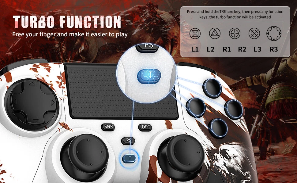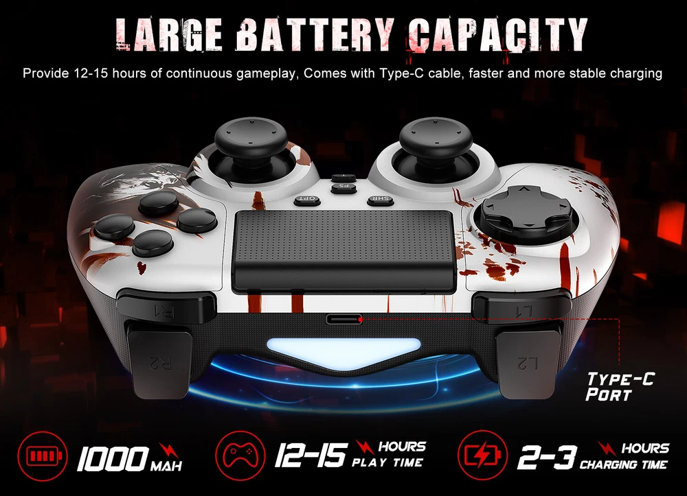 This wireless controller can perfectly support all versions of p4 consoles and console games, but also suitable for PC with Windows 7 and above systems and iOS 13/Android 5.0 and above phone. Controller has a built-in 1000 mah lithium battery, charged for 2hours, and can provide 12 hours of game life. controller can be used through wired or bluetooth wireless connection, and the bluetooth transmission distance can reach more than 10m,Fast and stable without delay. Controller comes with a 3.5mm stereo audio headphone port for connecting headphones and microphones. The built-in six-axis sensor can accurately sense the tilt angle of the handle and the acceleration information in three-dimensional space. Dual vibration motors provide more realistic gaming feedback. Description: Supporting platform: P4 all series/Android/IOS/Windows 7 and above Connection method: Bluetooth/Type c wired Product net weight: 270g Battery capacity: 1000mAh Charging voltage: DC 5V Use distance: 10 meters Packing List: 1x P4 Controller 1x Type c data cable 1x User manual 🎮【Multi-Platform Compatible】The Game Controller Compatible with P4/Slim/Pro Console/ PC windows 7/8/8.1/10/IOS 13 /Android 10 /MAC,Compatible P3 can only support wired connection (Note: you need to activate device with the USB cable in the package for the first connection.) 🎮【Precise Control & Turbo】 Game pad supports Turbo function, first press and hold the T/SHARE key, then press any function key, then the function key has Turbo burst function. The buttons are with high sensitivity and provide an accurate gaming experience. The analog sticks and trigger buttons are responsive and smooth, which are almost no input lag and drift. 🎮【Ergonomics Design】The asymmetrical grip and contour design of the joystick perfectly fits your hands, delivering a supper comfy holding. The custom for P4 controllers deliver high sensitivity and fast response overall performance, all buttons are easy to press and respond immediately, with good tactile feedback for maximum comfort and endless gaming experience. 🎮【Dual Vibration Feedback & Gyro Sensor】: The controller built-in dual Vibration motors and 6-axis gyroscope make the game more realistic for p4 game player and enables you feel every hit, crash, and explosion with hand-vibrating double shock response. 🎮【Wireless Connection&Strong Battery Life】The movement accuracy, feel, shape and sensitivity of the p4 gamepads analog sticks and trigger buttons have been enhanced, better grip feeling fit your hands more comfortably. The 1000mAh p4 gamepad controller takes just 2.5 hours to charge and up to 10 hours of playtime. Compatible with charging docks and USB cables.