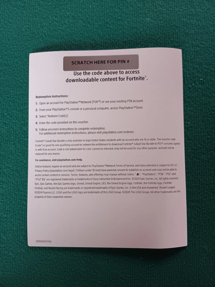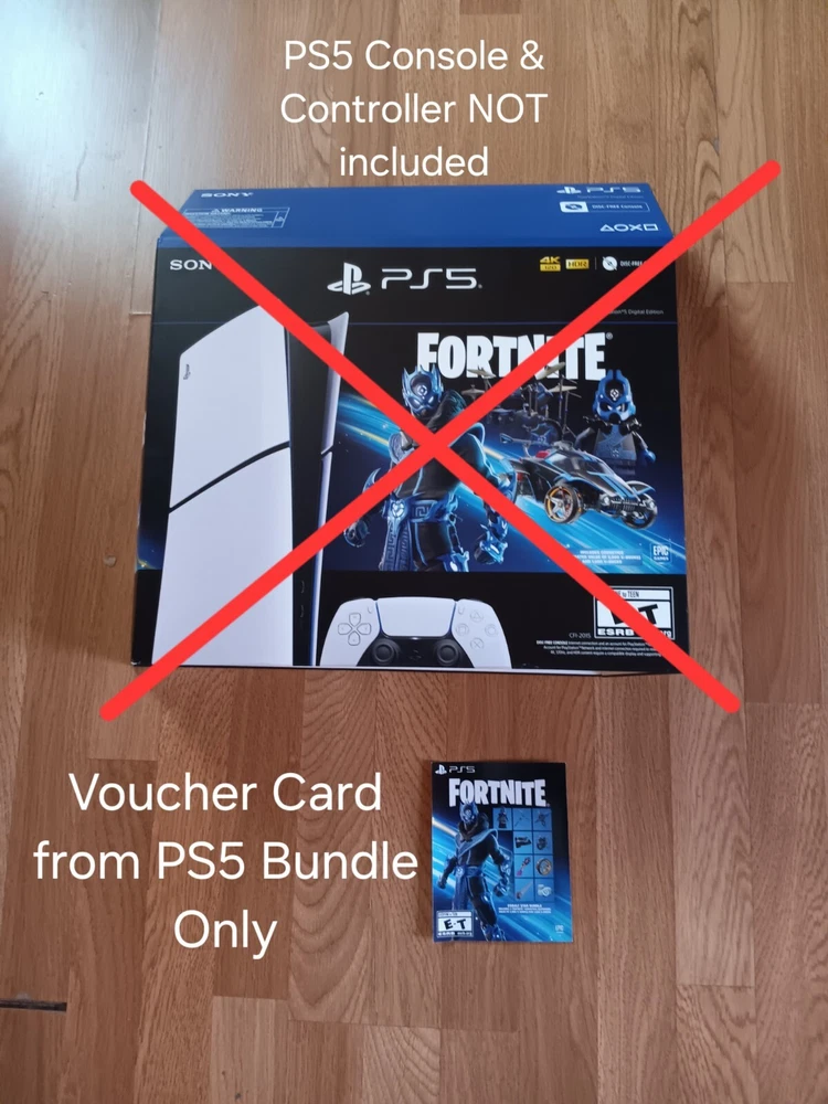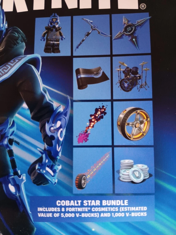 Purchase includes: x1 Fortnight Cobalt Star Bundle Voucher Code Card (Brand New with Unscratched Pin#): Includes 8 Fortnite Cosmetics (Estimated value of 5,000 V-Bucks) and 1,000 V-Bucks The card came inside the PS5 console bundle I recently purchased, but I don't play Fortnite so selling to the highest bidder. Card will ship in a small USPS flat rate envelope.