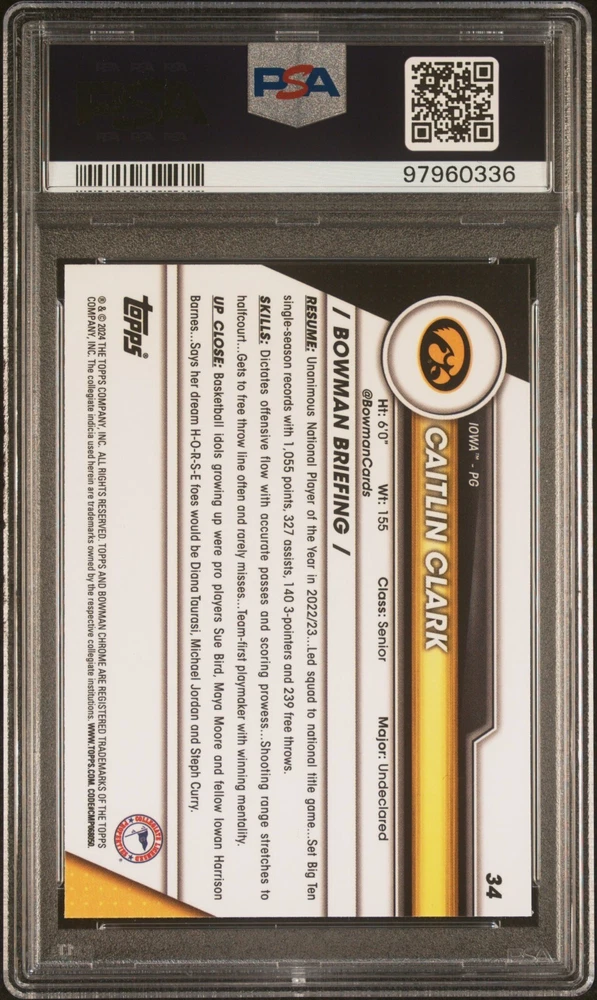 PSA 10 - 2023 Bowman Chrome U University CAITLIN CLARK RC #34