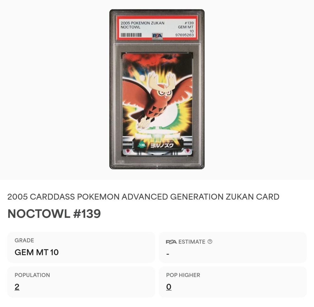 PSA 10 GEM MINT Noctowl #139 Carddass Zukan Advanced Gen. Bandai Pokémon POP 2. POP 2 as of 11/27/24. Please reach out with any questions and we would be happy to assist you. Returns are not accepted. You will receive the exact graded card pictured. Please see high resolution scans. Purchase of this item signifies agreement that Grade, Actual Condition and expected standards all match. Please see PSA website for more info. Shipping info: All graded cards are shipped securely in bubble mailer and cardboard box; regardless of price. Please reach out with any concerns before contacting ebay and we'd be happy to assist you. Please note that due to inventory accuracy, purchases will not be cancelled before or after shipping. Please reach out with any questions before purchase and we would be happy to assist you.