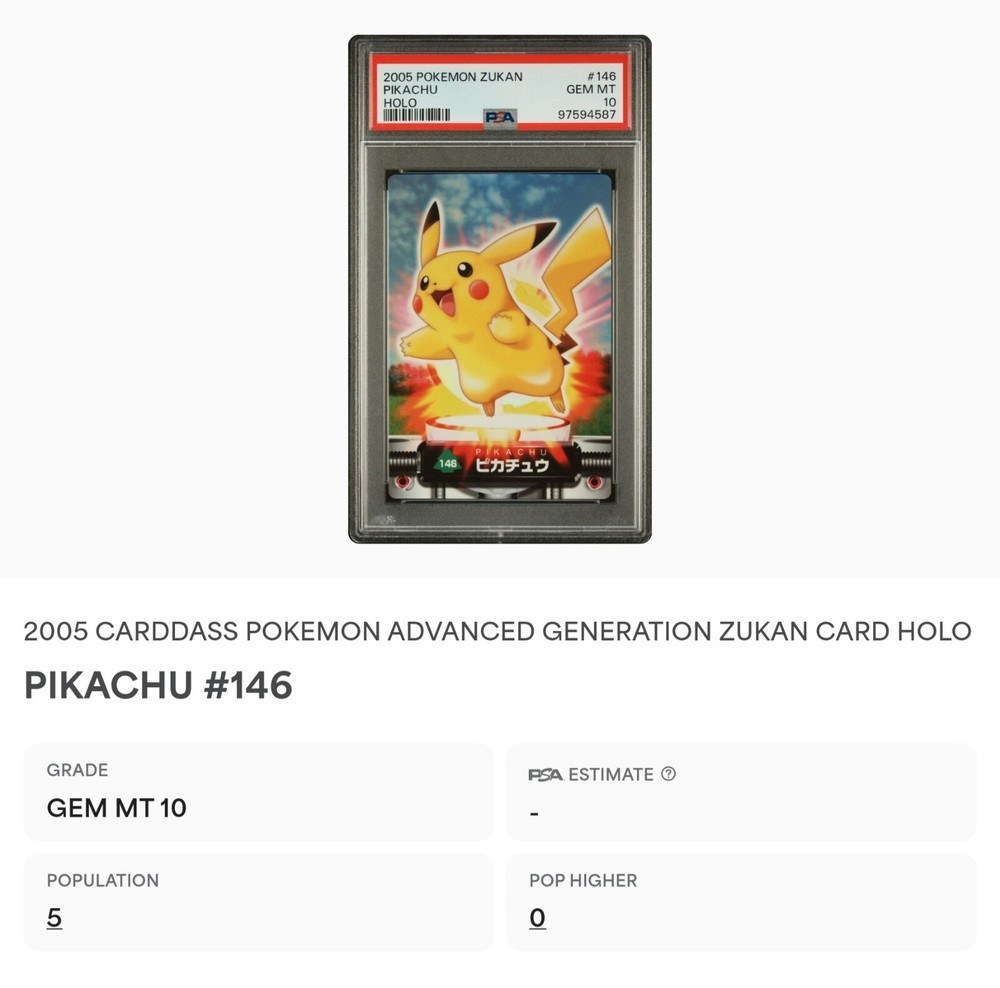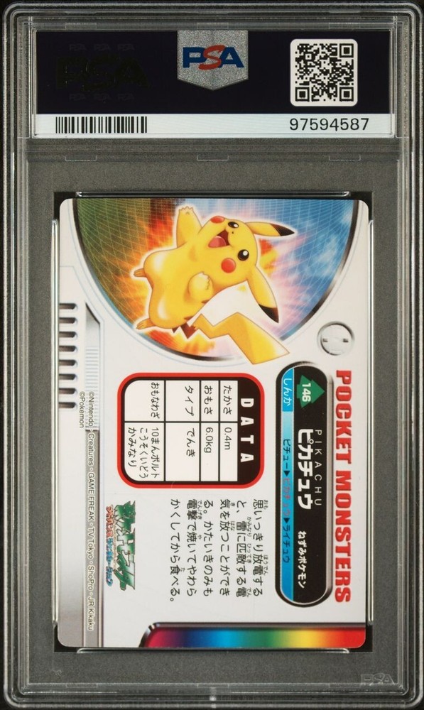 PSA 10 GEM MINT Pikachu #146 Carddass Advanced Gen. Holo Bandai Pokémon POP 5. POP 5 as of 11/26/24. Please reach out with any questions and we would be happy to assist you. Returns are not accepted. You will receive the exact graded card pictured. Please see high resolution scans. Purchase of this item signifies agreement that Grade, Actual Condition and expected standards all match. Please see PSA website for more info. Shipping info: All graded cards are shipped securely in bubble mailer and cardboard box; regardless of price. Please reach out with any concerns before contacting ebay and we'd be happy to assist you. Please note that due to inventory accuracy, purchases will not be cancelled before or after shipping. Please reach out with any questions before purchase and we would be happy to assist you.