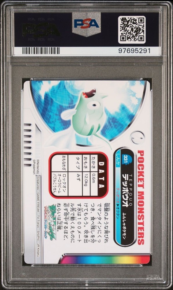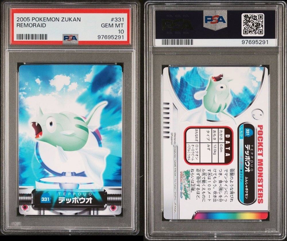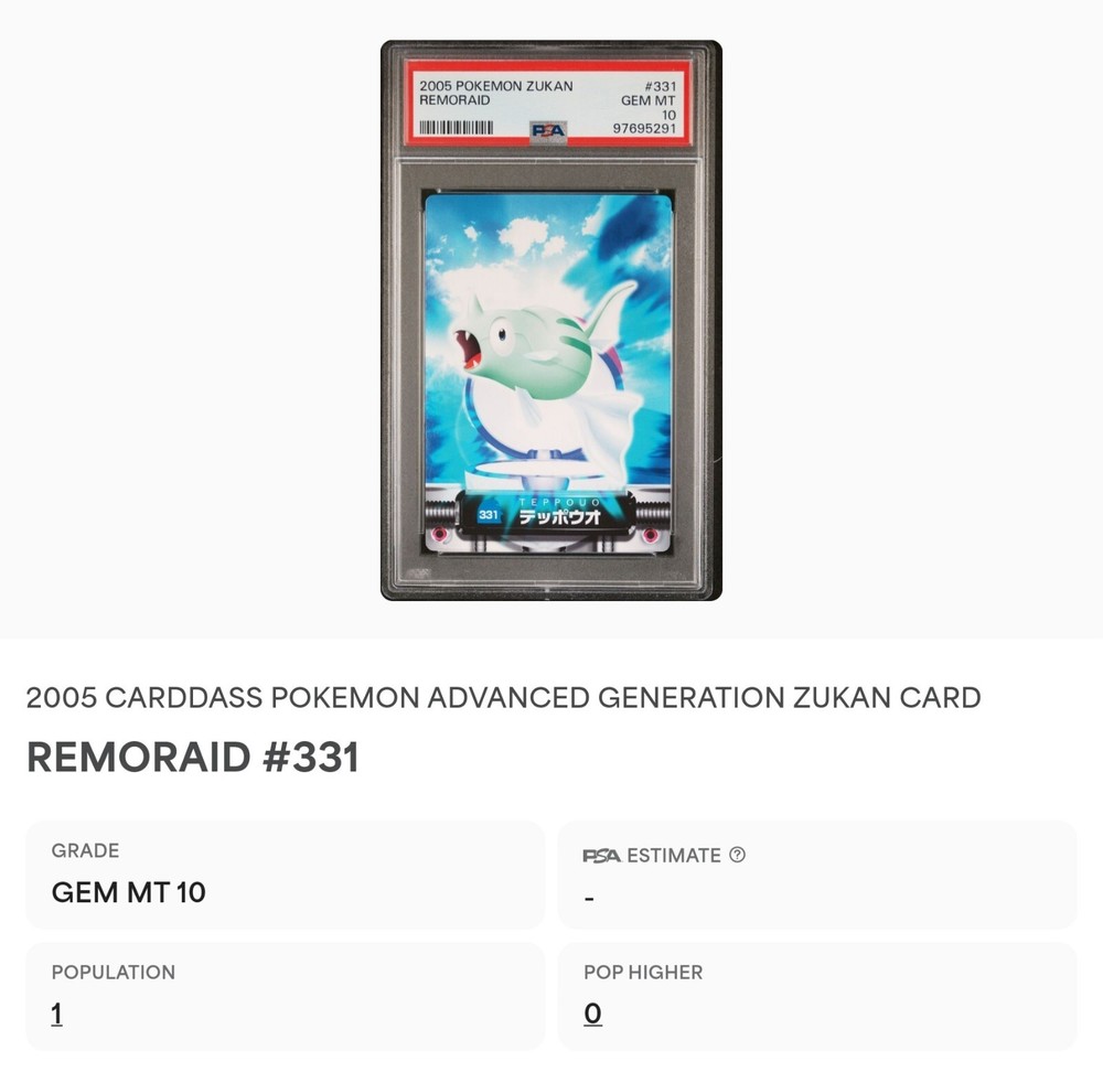 PSA 10 GEM MINT Remoraid #331 Carddass Zukan Advanced Gen. Bandai Pokémon POP 1. POP 1 as of 11/29/24. Please reach out with any questions and we would be happy to assist you. Returns are not accepted. You will receive the exact graded card pictured. Please see high resolution scans. Purchase of this item signifies agreement that Grade, Actual Condition and expected standards all match. Please see PSA website for more info. Shipping info: All graded cards are shipped securely in bubble mailer and cardboard box; regardless of price. Please reach out with any concerns before contacting ebay and we'd be happy to assist you. Please note that due to inventory accuracy, purchases will not be cancelled before or after shipping. Please reach out with any questions before purchase and we would be happy to assist you.