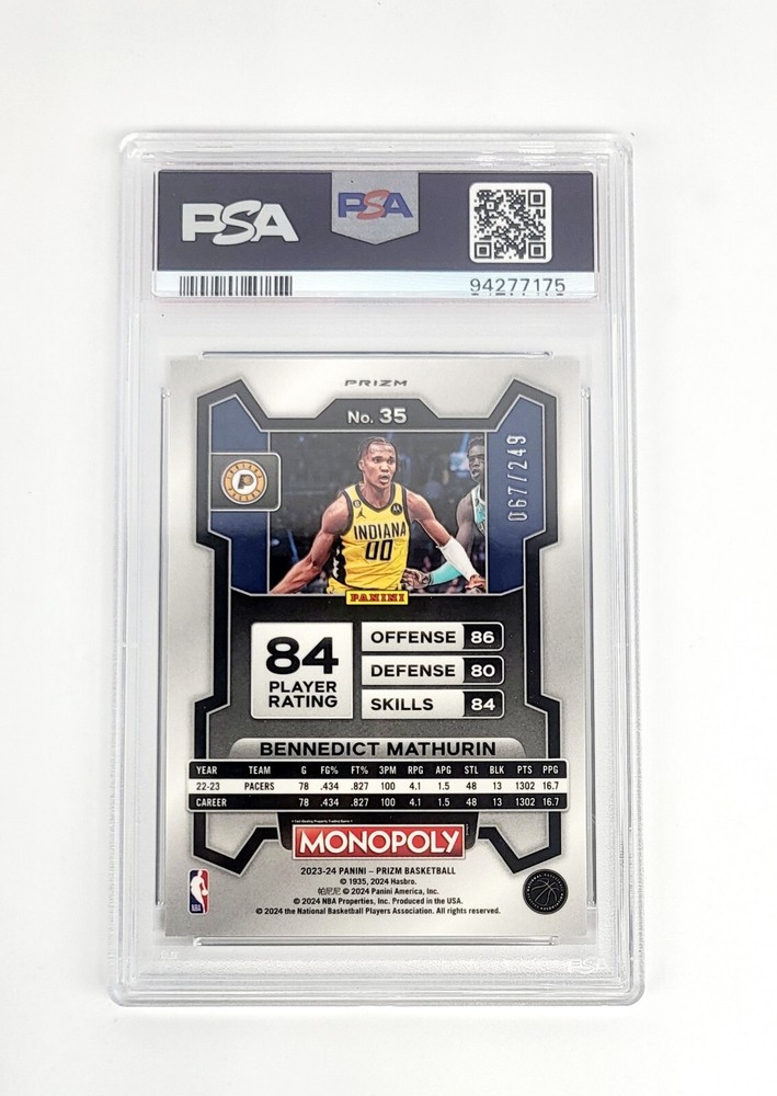 This limited edition sports trading card features Bennedict Mathurin, a player from the Indiana Pacers and Arizona Wildcats, in the 2023-24 Panini Prizm Monopoly set. With a PSA grade of Gem Mint 10, this card is in pristine condition and is a must-have for any collector. The Brown Prizm parallel/variety adds a unique touch to this already exclusive card, making it a standout addition to any sports trading card collection. Serial numbered and short printed, this card is also an insert and chase, with features that include limited edition and exclusive. Don't miss out on the chance to own this rare and valuable piece of sports memorabilia.