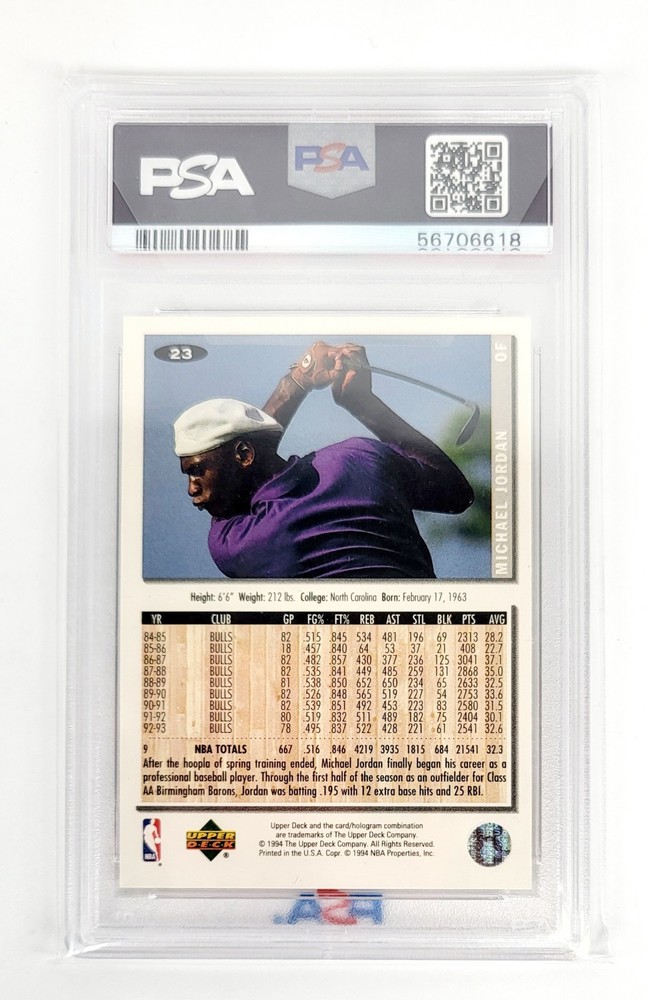 Capture a piece of sports history with this 1994 Collector's Choice Baseball card featuring the iconic Michael Jordan. Graded Mint by PSA, this card celebrates Jordan's tenure with the Chicago White Sox as he transitions from his legendary basketball career to a part-time minor league baseball career. As card number 23 in the set, it's a must-have for collectors and fans alike. The card boasts an array of exclusive features including its Rookie status, Short Print designation, and the fact that it's a Limited Edition piece. Whether you're a fan of Jordan's time in the NBA, a follower of his efforts in Minor League Baseball, or simply a collector of sports memorabilia, this card is sure to be a standout in any collection.