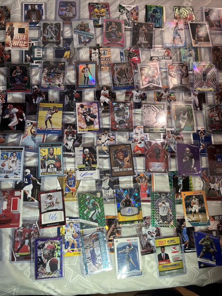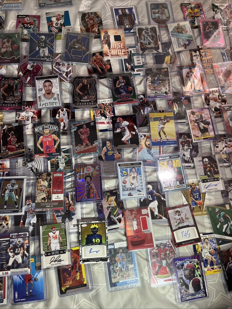 This is a sports trading card lot featuring three autographed rookie patch cards from the 2021 season of the National Football League (NFL) and other sports leagues. The cards are autographed by players such as Cj Stroud, Allen Iverson, Aaron Jones, and A.J. Brown. Each card is framed and serial numbered, with hologram authentication from Panini Authentic. The lot includes a mix of rookie, parallel, 1st edition, insert, and chase cards from various teams like the Cincinnati Bengals, Green Bay Packers, Chicago Bulls, and more. These limited edition cards are in pristine condition, making them a valuable addition to any collector's collection.