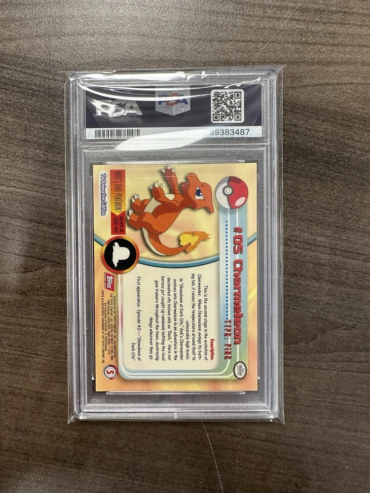 This is a Charmeleon #5 card from the 1999 Pokémon set Topps T.V. Animation. It has been professionally graded by PSA in a Near Mint-Mint 8. The certification number is 99383487.