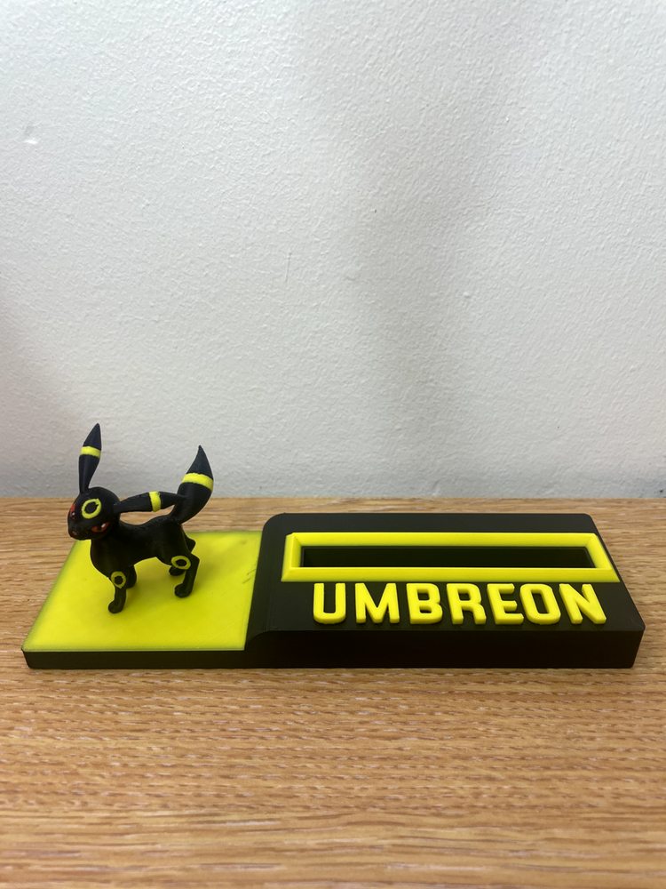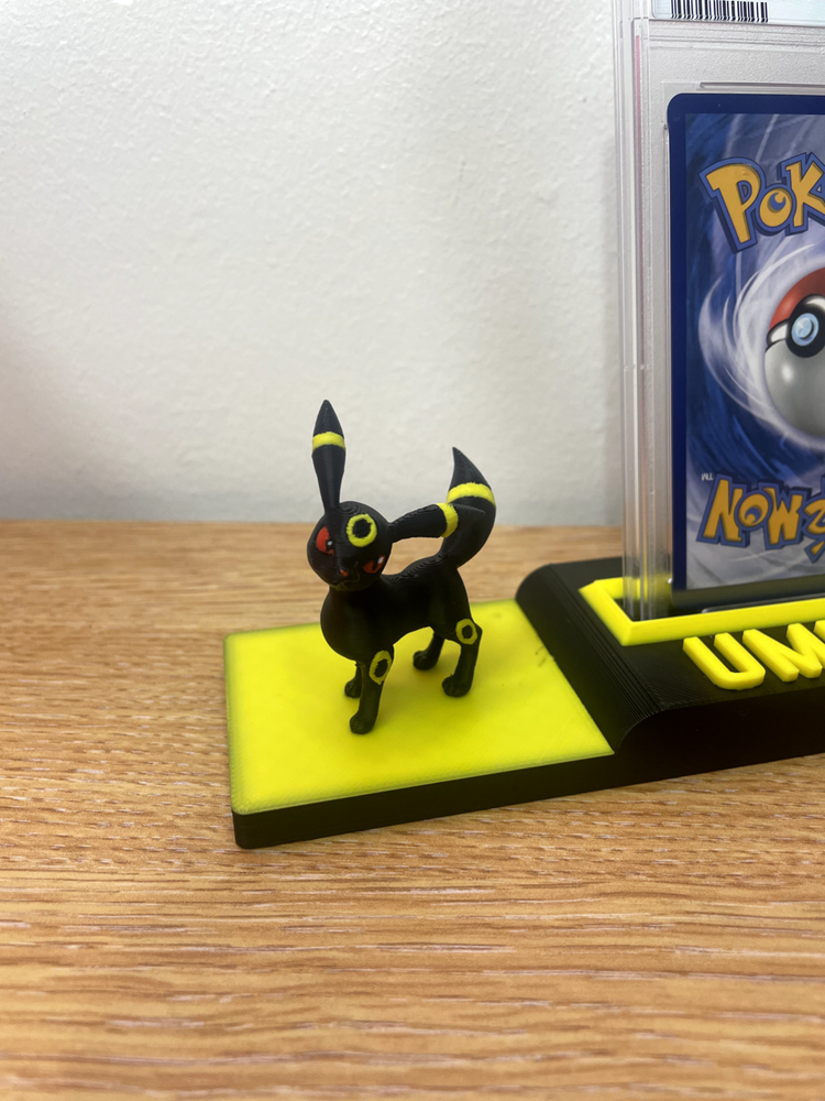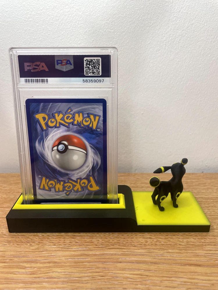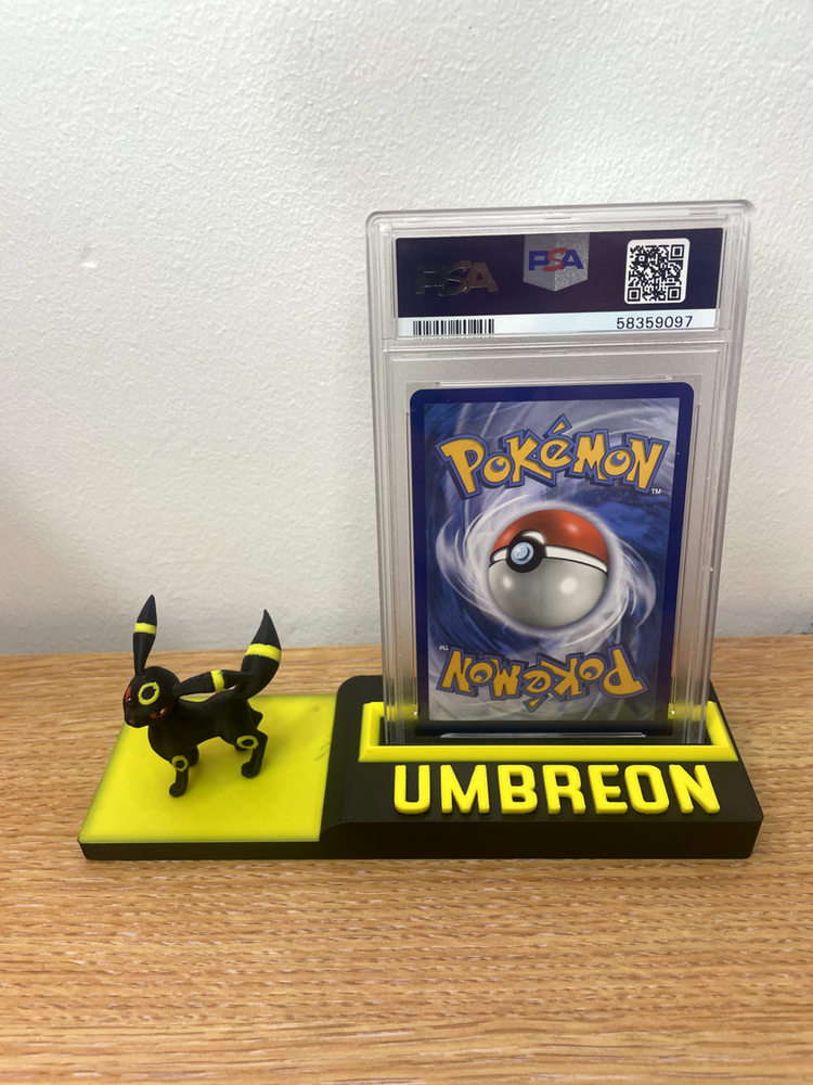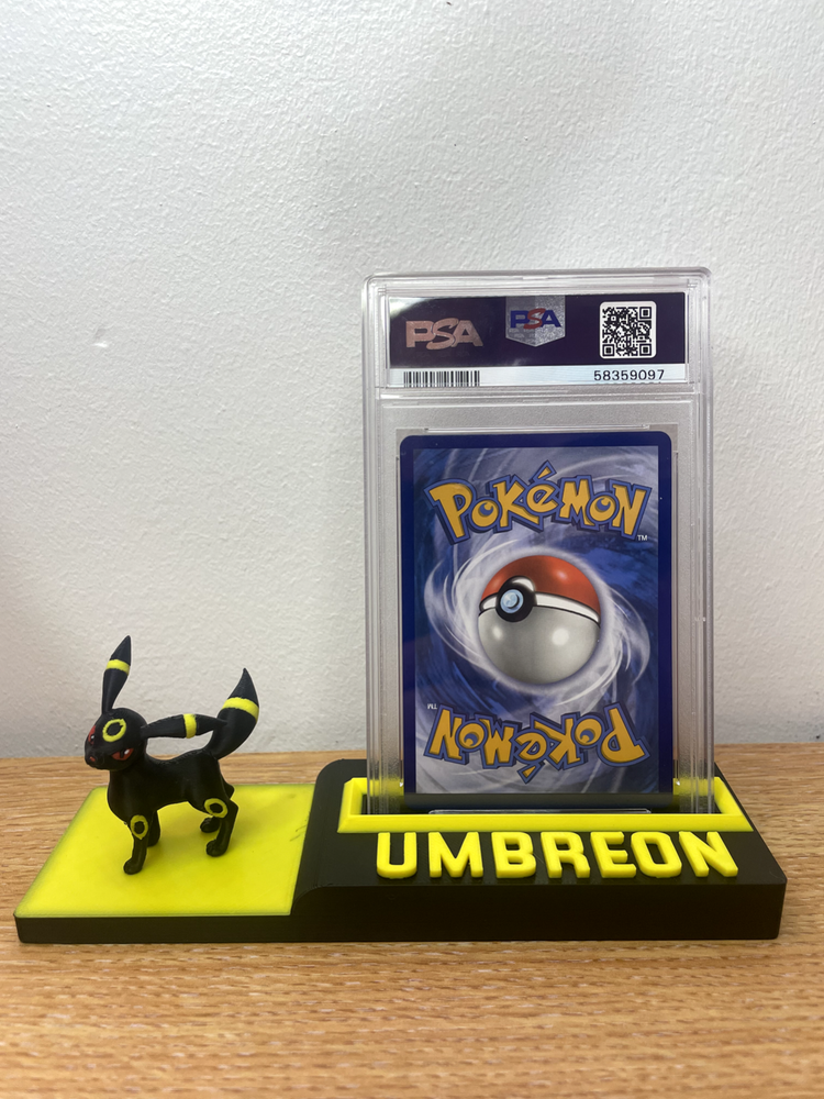 DISPLAY STAND ONLY/ POKEMON CARDS NOT INCLUDED Novelty Pokemon stand to display your cherished UMBREON card stand is compatible with PSA/ACE and MGC graded slabs or you can display a non graded card More display stands available to suit your favourite Pokemon (check out our listings ) discounts for multiple purchases. If we DON'T have the stand you need, drop us a message so we can get it made for you. All custom orders welcome , no order to big and no order to small. text and colours can also be customised crafted using high quality materials and top of the range 3D printing machinery.
