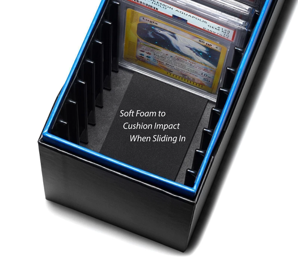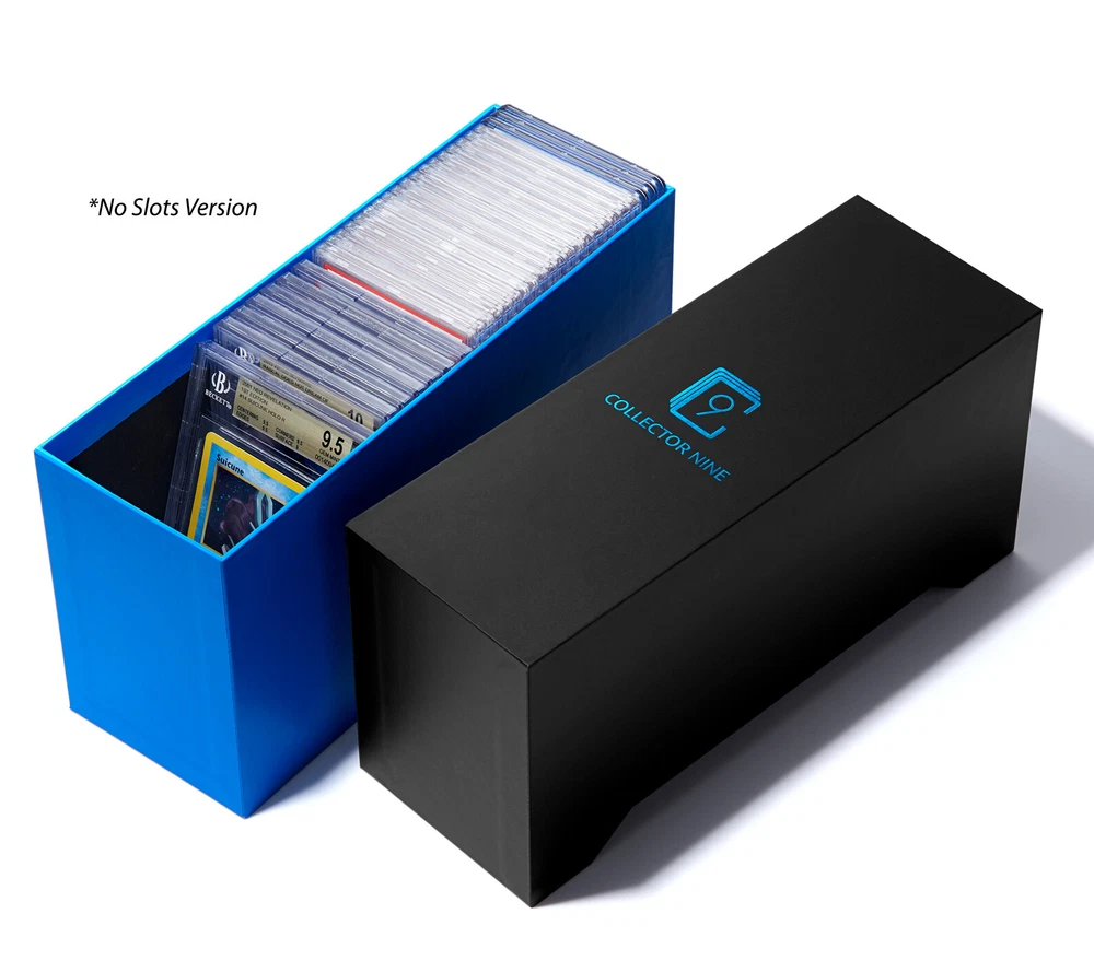 eBay Template Home Graded Cards Accessories TCG Categories Graded YuGiOh Graded Pokemon Graded Weiss Schwarz TCG Accessories PSA-BGS-CGC Storage Case w/ Slots Option | Graded Card Slab Box Holder | Co Nine Description Our Storage Case for PSA, BGS, CGC, & other similarly sized graded cards. Lined beautifully with sheen matte, well spaced slots, and neoprene foam at the base to cushion your cards. It's a sleek & easy to use storage box to keep your cards safe & accessible at any time. Compatible with Graded Slabs up to 13.5cm in length (PSA length) & 8.3cm in width (BGS width). Slots accommodate up to 1cm in thickness Stores 20 graded cards Mix & Match with slots and up to 45 PSA/CGC, 32 BGS graded cards without Easy & versatile way to organize & search your collection Lined with Neoprene Foam at the base to provide cushion & grip for your cards Sleek & minimal design to add a premium aesthetic to your collection * Top can also be fitted to the bottom to keep your cards accessible at any moment while making the most efficient use of it's space. Orders are shipped within 1 business day ( Visit our store for graded card accessories ) Other Items For Your Consideration: PSA-BGS-CGC Storage Case w/ Slot and Strap Option | Home & Travel $44.95 View Item PSA-BGS-CGC Display Case | Magnetic Flip Graded Card Gift Box $11.95 View Item PSA-BGS-CGC Acrylic Stand Clear/Colors For Graded Card Display $9.95 View Item Storage Case For One-Touch Magnetic Holder w/ Slots Option $19.95 View Item
