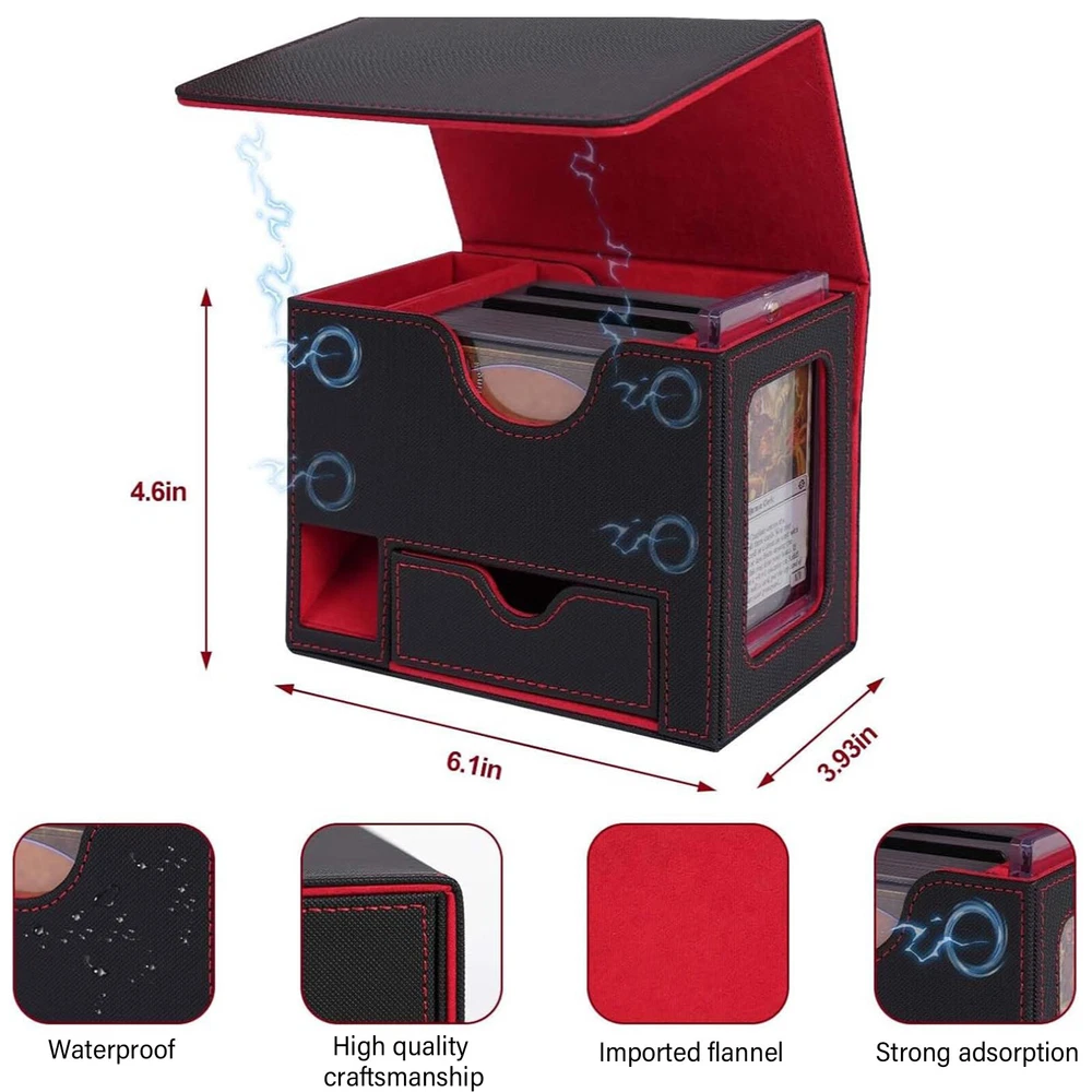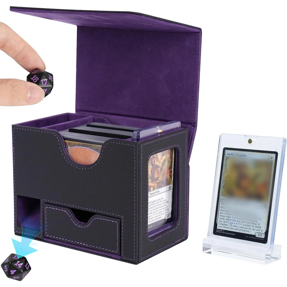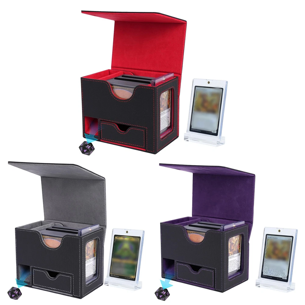 Product Description PU Card Deck Case Trading Card Storage Box W/1PC 35PT Card Protect Holder& Stand Features: -Spacious Storage Capacity: This MTG deck box features one compartment with window and a dice compartment, capable of holding up to 120 single-sleeved cards or 100+ double-sleeved cards, offering ample space for your entire collection. -Universal Compatibility: With its strong magnetic clasp and versatile design, this deck box is suitable for storing all TCG/CCG or collectible card games, including but not limited to Magic: The Gathering, Pokemon, YuGiOh!, Star Wars X-Wing, Game of Thrones, World of Warcraft, Force of Will, Five Rings, Cardfight!! Vanguard, Duel Masters, Panini Soccer, Baseball, Basketball cards, and more. It's the ideal gift for any card game enthusiast, specifically designed for Commander EDH players. -Classic Black Leather Exterior: Combining timeless elegance with durability, the black leather exterior paired with a dynamic suede interior creates a stylish and protective deck box. The exterior leather is waterproof and easy to clean, ensuring hassle-free maintenance and long-lasting use. -Strong Magnetic Closure: The secure magnetic clasp ensures a snug fit, offering perfect protection for your trading cards during storage and transportation. -Gift-Ready and Stylish: With its exquisite craftsmanship and sleek design, this deck box makes an ideal gift for any card game enthusiast. Specification : Material ; PU leather Color : Red,Puple,Gray Outer size : 15.5*10.1*12.2cm Package included: 1 x Deck box 1 x 35pt card protect holder& stand 2 x Black divider OR 1 x 35pt card protect holder& stand