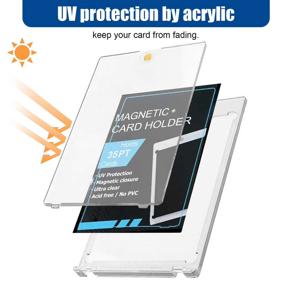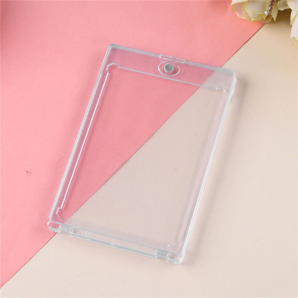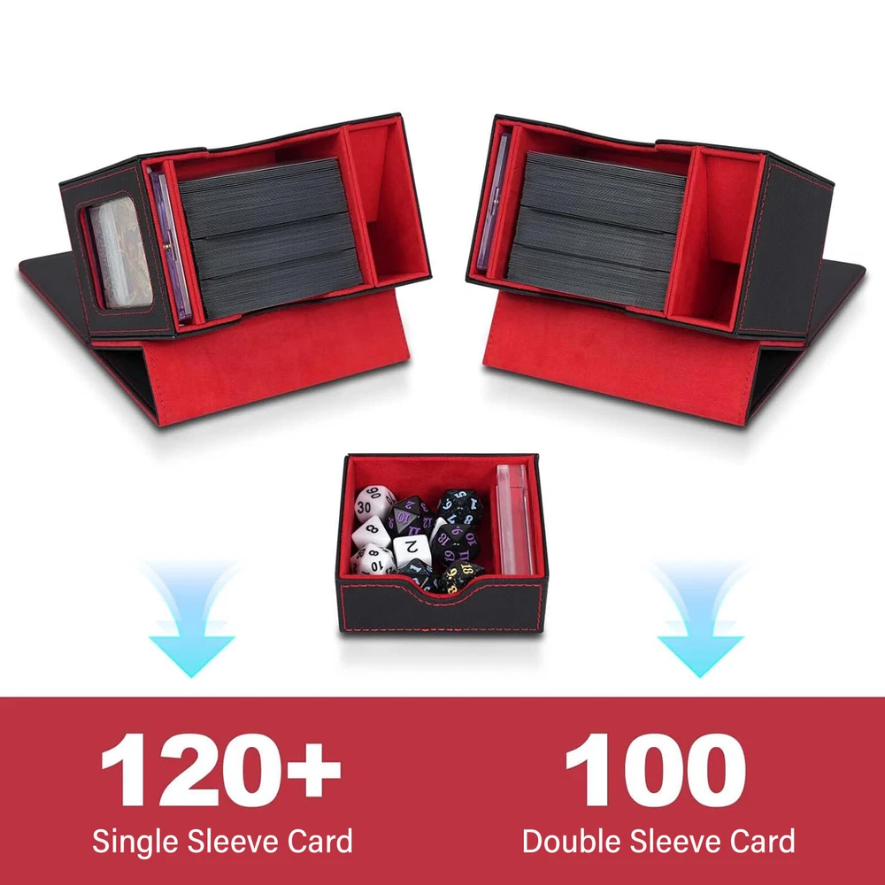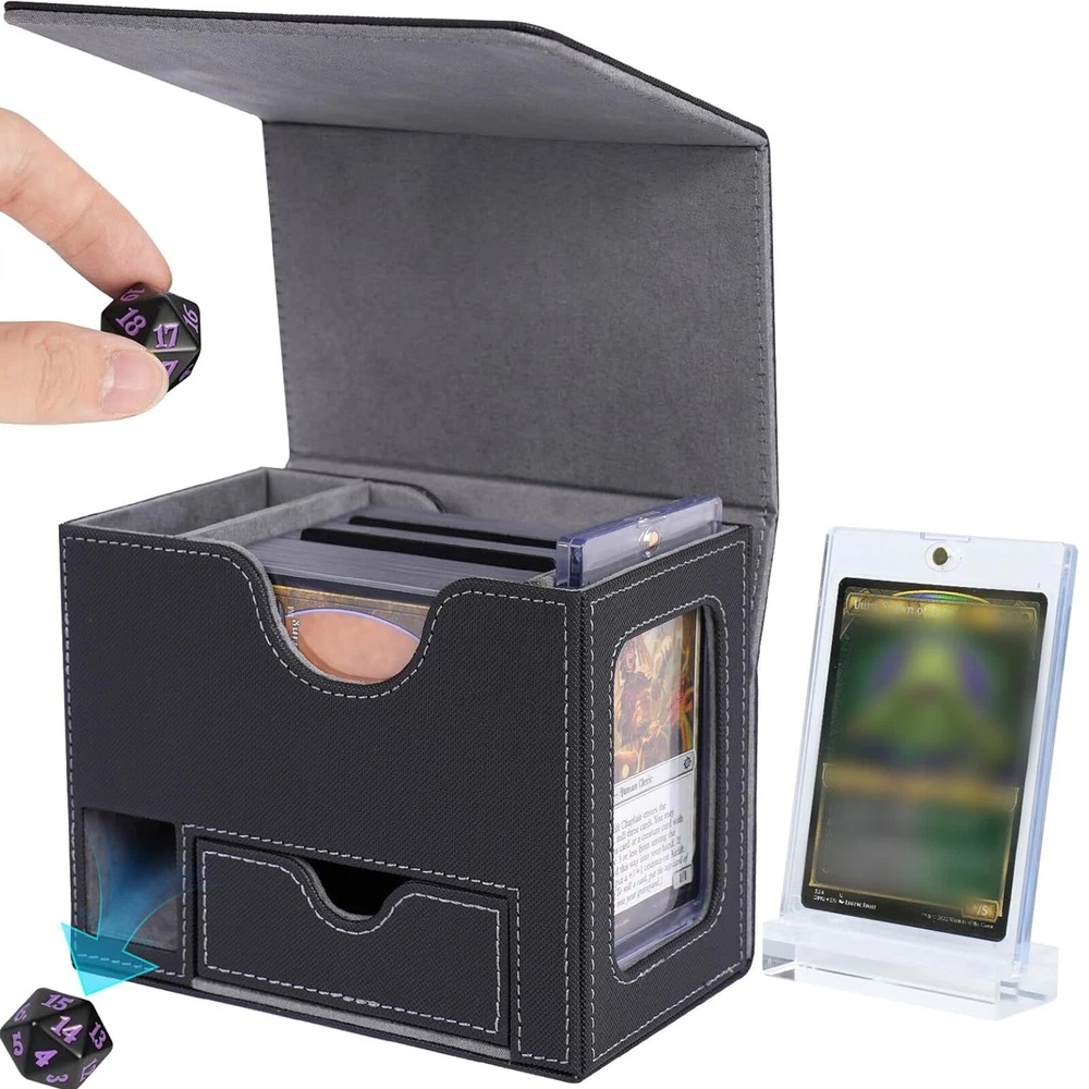 Product Description PU Card Deck Case Trading Card Storage Box W/1PC 35PT Card Protect Holder& Stand Features: -Spacious Storage Capacity: This MTG deck box features one compartment with window and a dice compartment, capable of holding up to 120 single-sleeved cards or 100+ double-sleeved cards, offering ample space for your entire collection. -Universal Compatibility: With its strong magnetic clasp and versatile design, this deck box is suitable for storing all TCG/CCG or collectible card games, including but not limited to Magic: The Gathering, Pokemon, YuGiOh!, Star Wars X-Wing, Game of Thrones, World of Warcraft, Force of Will, Five Rings, Cardfight!! Vanguard, Duel Masters, Panini Soccer, Baseball, Basketball cards, and more. It's the ideal gift for any card game enthusiast, specifically designed for Commander EDH players. -Classic Black Leather Exterior: Combining timeless elegance with durability, the black leather exterior paired with a dynamic suede interior creates a stylish and protective deck box. The exterior leather is waterproof and easy to clean, ensuring hassle-free maintenance and long-lasting use. -Strong Magnetic Closure: The secure magnetic clasp ensures a snug fit, offering perfect protection for your trading cards during storage and transportation. -Gift-Ready and Stylish: With its exquisite craftsmanship and sleek design, this deck box makes an ideal gift for any card game enthusiast. Specification : Material ; PU leather Color : Red,Puple,Gray Outer size : 15.5*10.1*12.2cm Package included: 1 x Deck box 1 x 35pt card protect holder& stand 2 x Black divider OR 1 x 35pt card protect holder& stand