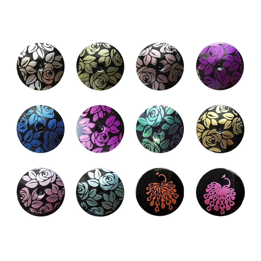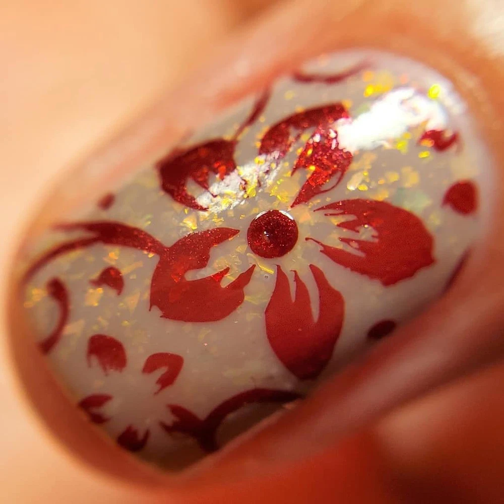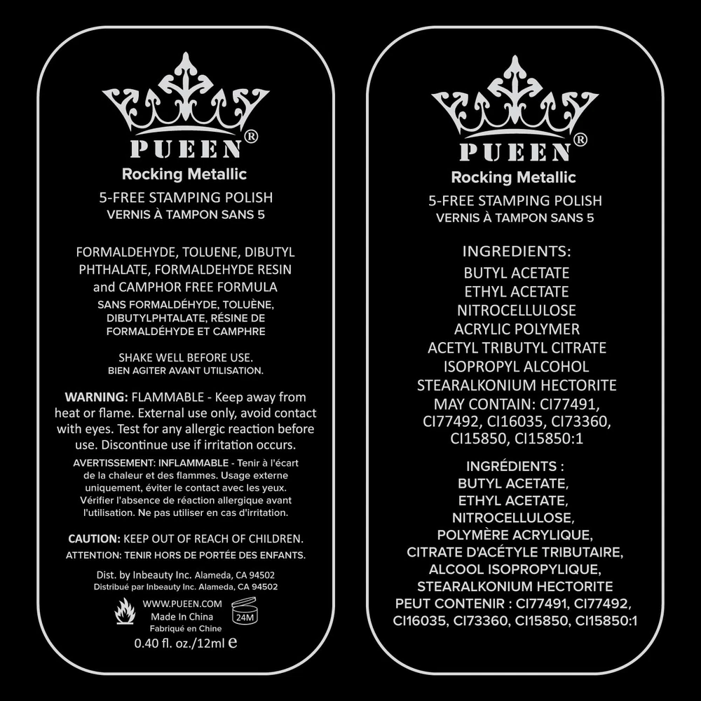 BIG5FREE FORMULA NAIL POLISH FOR STAMPING Highly pigmented formula is great for stamping Stamps great over black colors Colors: Silver Dust 601, Love Affair 605, Ocean Blue 607, Hathaway Gold 609, Mighty Aphrodite 610, Mexicali Turquoise 611, Golden Delicious 603, Twilight Magenta 604, Pink Ladies 606, Cool Aqua 608, Ruby Gem 612, Hot Fuchsia 613 12 metallic colors, 12ml each