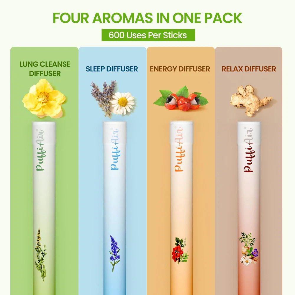 PUFFIAIR Herbal Diffuser Pen 4 Pack Clean Botanical Aromatherapy Diffusers Four Four Aromas in One Complete Pack: This 4-pack includes four distinct PUFFIAIR herbal diffuser pens, each featuring a unique botanical aroma designed for different moments throughout your day Balanced Aroma Profiles for Everyday Routines: From cool mint freshness to soft herbal and calming notes, this set offers a versatile range of aromatic experiences to match changing moods and routines. Clean Botanical Formula, No Additives: Made with thoughtfully selected botanical ingredients and crafted for a clean aromatherapy experience without unnecessary additives Smooth & Comfortable Experience: Each diffuser pen is designed for a smooth, gentle aromatic experience with no harsh sensation, suitable for regular daily use Long-Lasting & Easy to Use: Up to 600 uses per pen. No charging, no refilling, and no maintenance required—simply open and enjoy anytime, anywhere PUFFIAIR Herbal Diffuser Shipping We offer FREE shipping on all orders! We ship within Three business days of payment, usually sooner. We use a selection of shipping services such as UPS, FedEx, USPS etc. We only ship to the lower 48 states, no APO/FPO addresses or PO Boxes allowed. Local pickups and combined shipping options are not provided at this time. Return You can return a product for up to 30 days from the date you purchased it. Any product you return must be in the same condition you received it and in the original packaging. Please keep the receipt. Payment We accept payment by any of the following methods: PayPal Please pay as soon as possible after winning an auction, as that will allow us to post your item to you sooner! Feedback Customer satisfaction is very important to us. If you have any problem with your order, please contact us and we will do our best to make you satisfied. Contact Us If you have any queries, please contact us via ebay. We usually respond within 24 hours on weekdays. Please visit our eBay store to check out other items for sale! Thank you for shopping at our store.