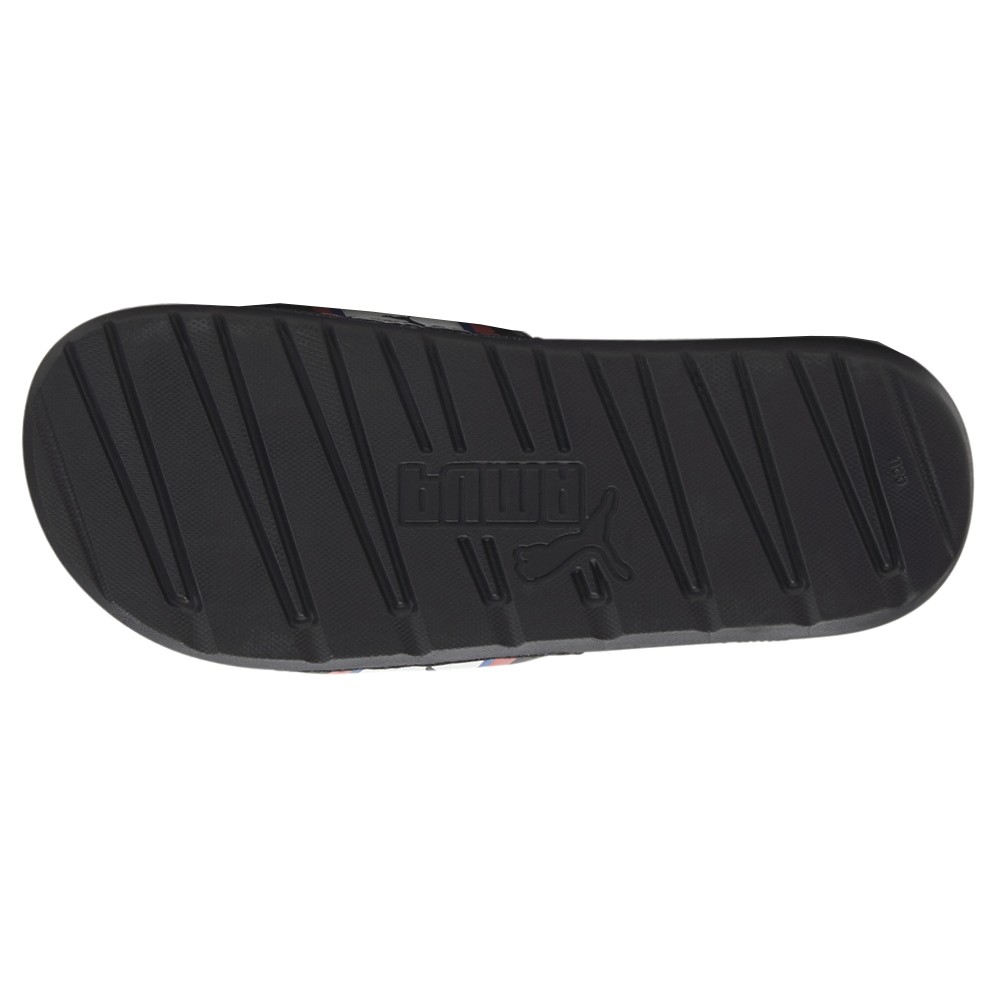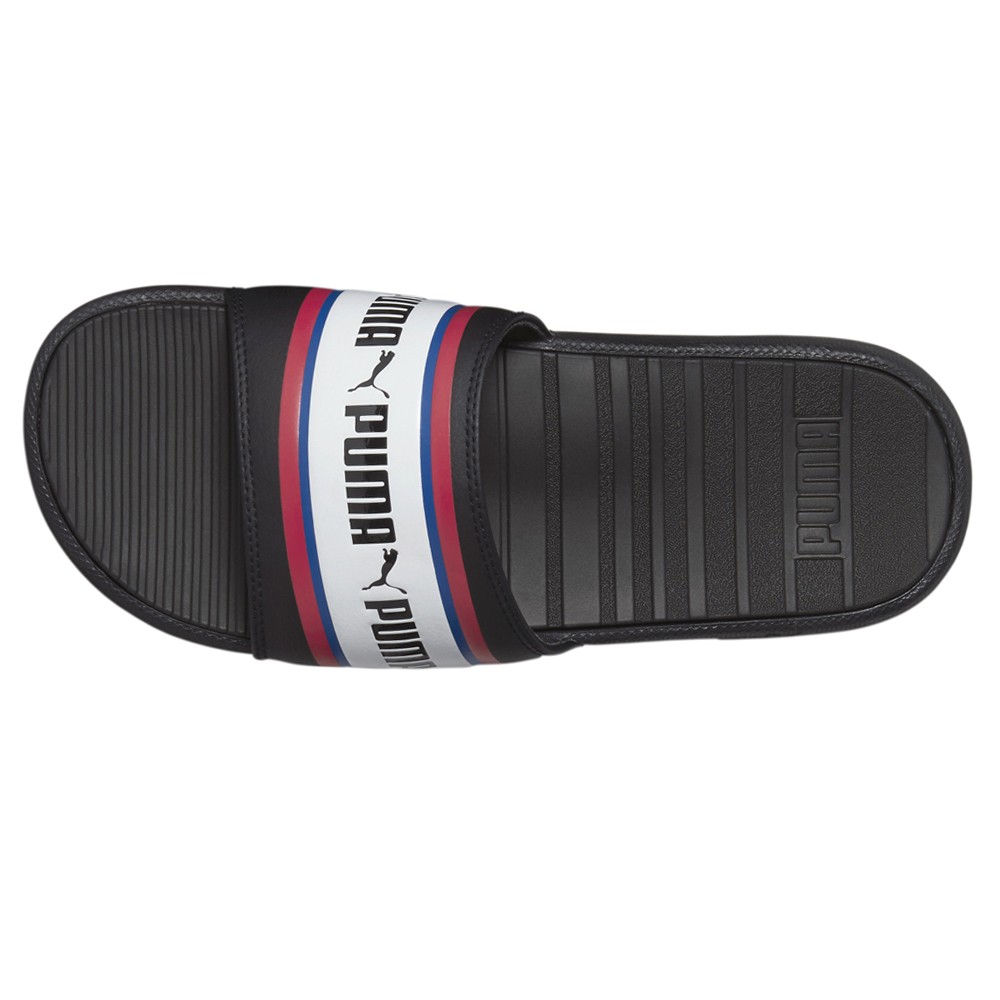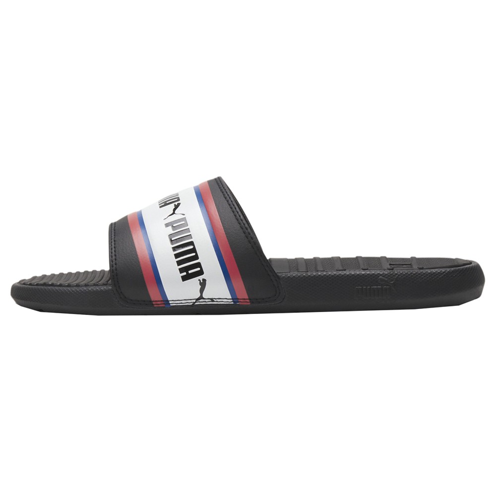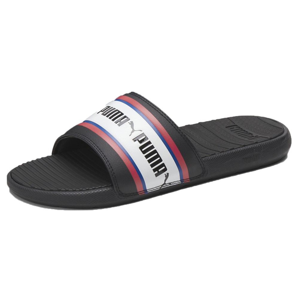 Cool Cat Stripe Repeat Slide Sandals Product Details Leather upper EVA midsole Cushioned footbed Rubber outsole Color: Puma Black-Puma White-High Risk Red Slide on into these comfortable Cool Cat Stripe Repeat Sandals. With a built in lightweight EVA midsole and textured foot bed, your kids will be comfortable running around. Additional Details Manufacturer Color: Puma Black-Puma White-High Risk Red Color: Black Occasion: Casual Gender: Mens Age: Adult Brand: Puma