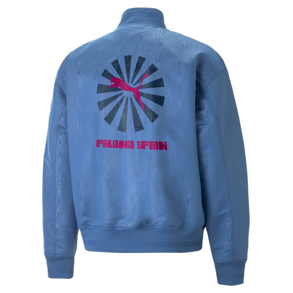 Palomo X Lightweight Full Zip Jacket Product Details Relaxed fit Moire effect 2-way zip closure Engineered rib collar, cuffs, and hem 100% Polyester The second season of PUMA x PALOMO takes inspiration from both summer sports and vintage surf posters from Hawaii and the south of Spain. The collection's pieces feature bold, colourful graphics and a ‘70s-inspired aesthetic – including this jacket. The moire-effect exterior is teamed with a retro-inspired back graphic for a true throwback look. Additional Details Color: Blue Occasion: Casual Gender: Mens Age: Adult Brand: Puma