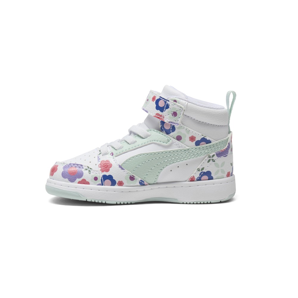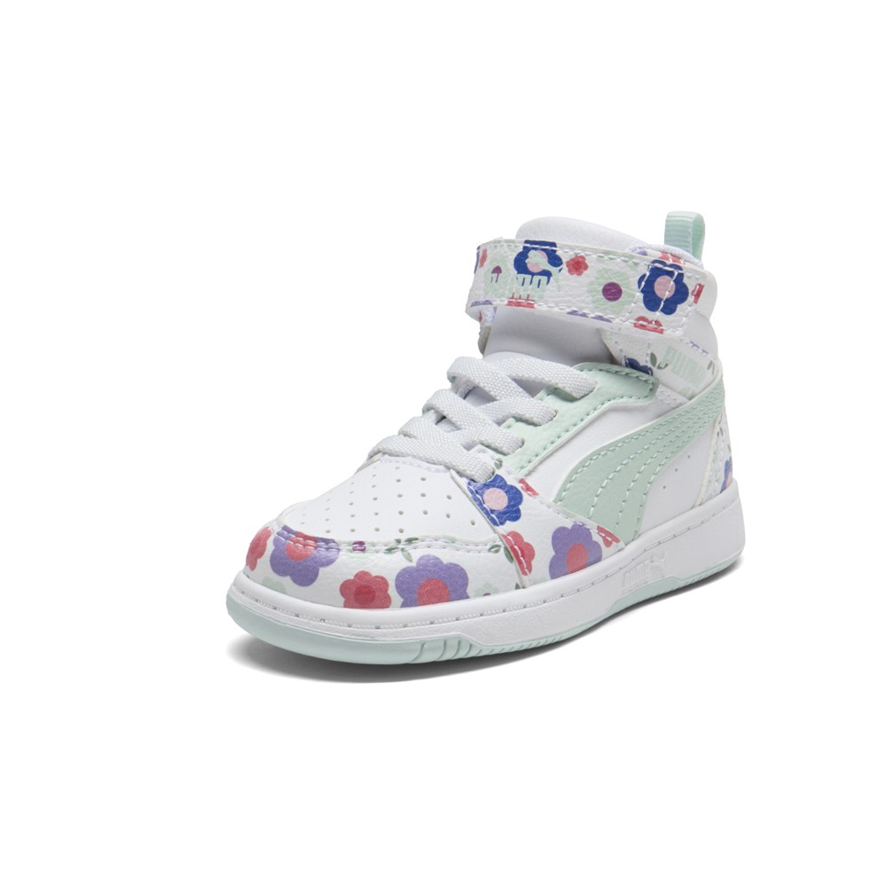 Rebound V6 Flower Floral High Top Sneakers (Toddler) Product Details Synthetic and textile upper Elastics & hook and Loop Textile lining Rubber outsole Color: PUMA White-Peaceful Blue-Green Moon Let little feet shine with PUMA's mid-cut sneakers. Featuring a supportive collar, rubber outsole for stable steps, and fun PUMA branding on the tongue and sides. Easy elastic laces and hook-and-loop closure make them perfect for any adventure. Classic PUMA style, reimagined for little champions. Additional Details Manufacturer Color: PUMA White-Peaceful Blue-Green Moon Color: White Occasion: Casual Gender: Girls Age: Toddler Brand: