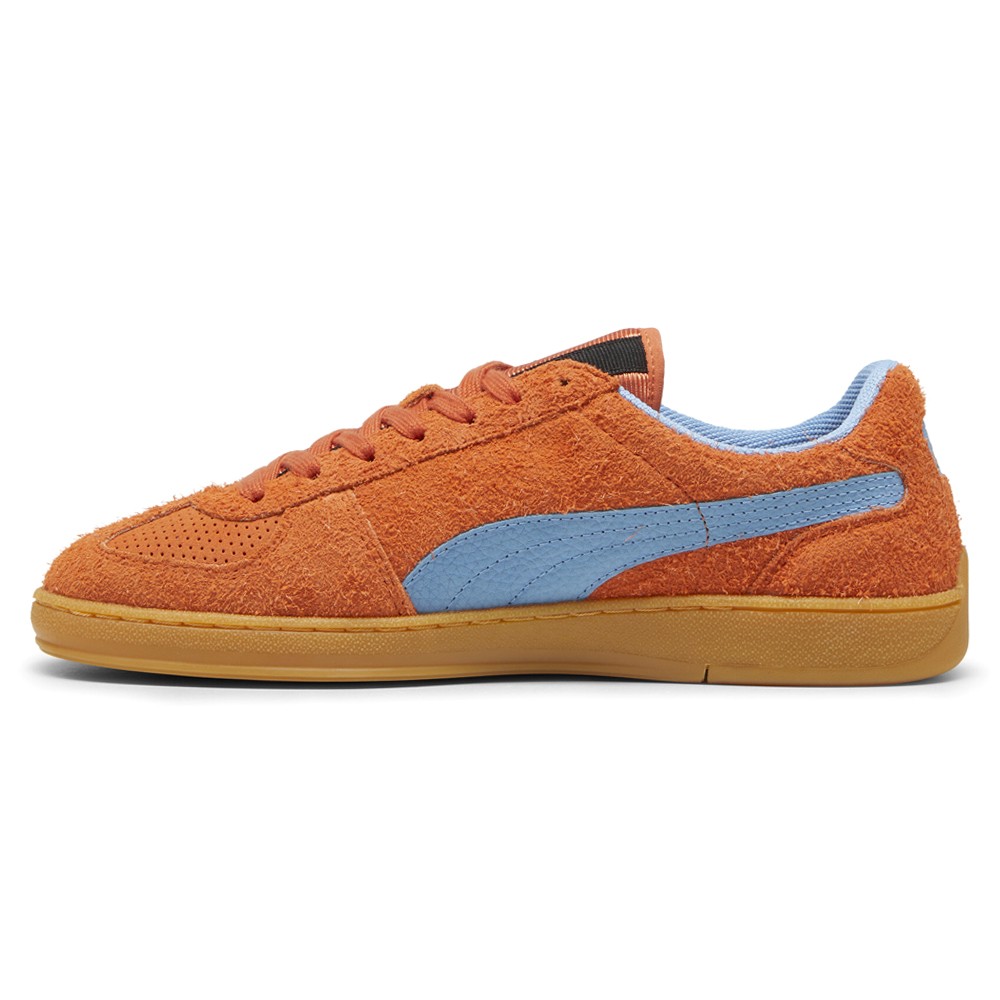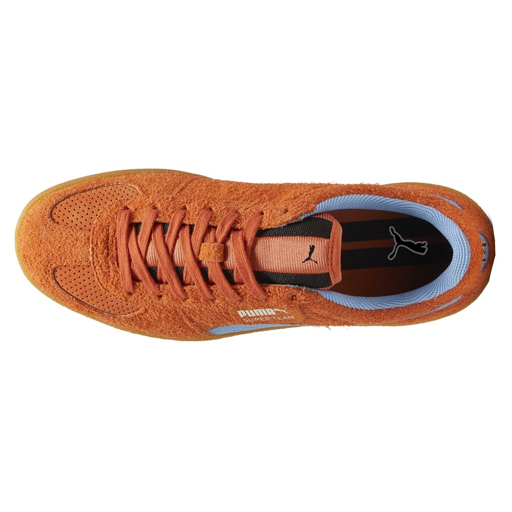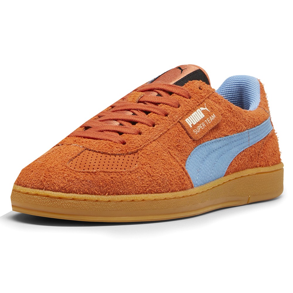 Super Team No 14 Lace Up Sneakers Product Details Leather upper Hairy suede toe cap, quarter flap, eyestay and heel overlay Suede perforated vamp Glossy textile tongue with stripes Textile collar The Super Team sneakers first hit the scene in 1982. Fast forward to the 2020s and we're bringing it back. This version stays true to the OG, made for handball goalkeepers, but adds inspiration from the Dutch national football team kit. It features a hairy suede, perforated vamp and striped tongue details. Additional Details Color: Orange Occasion: Gender: Mens Age: Adult Brand: Puma