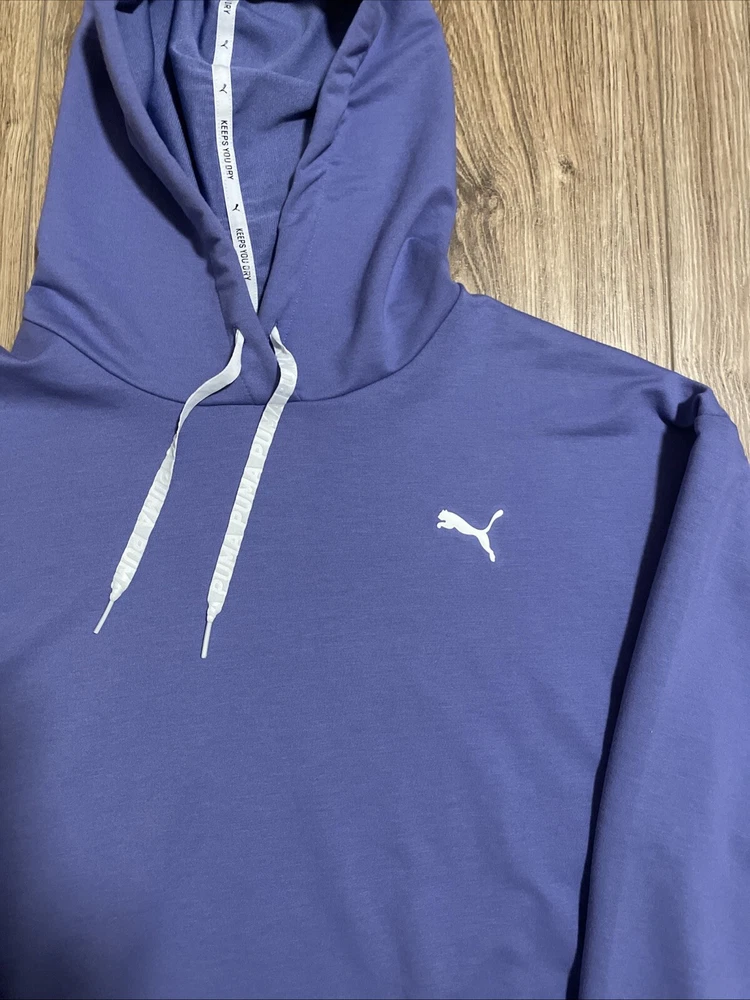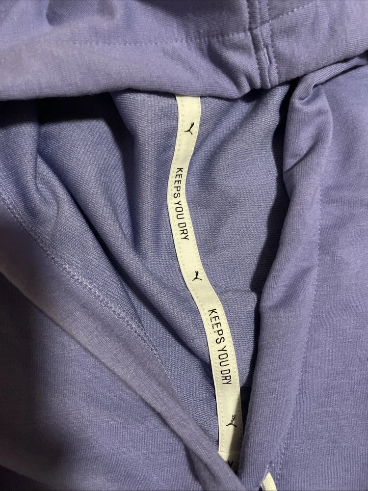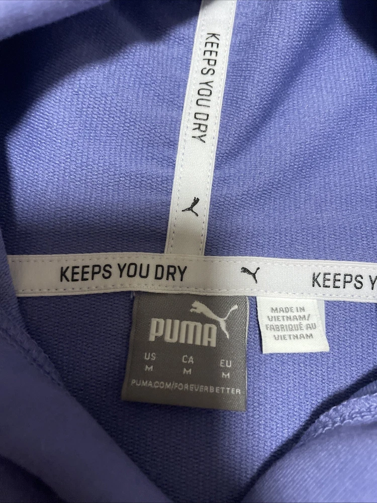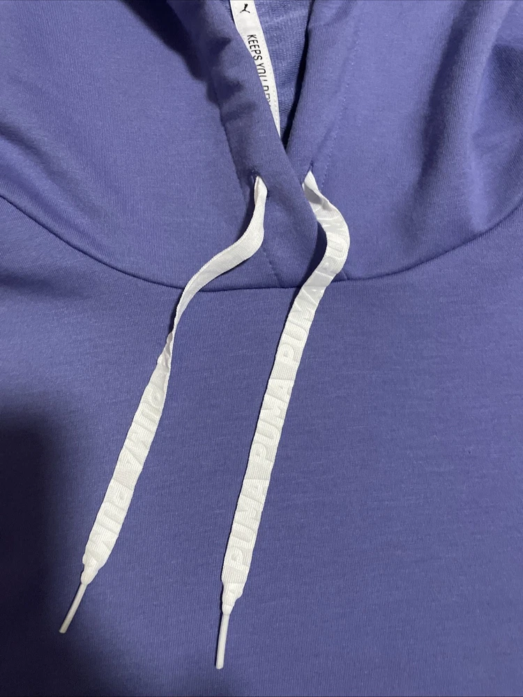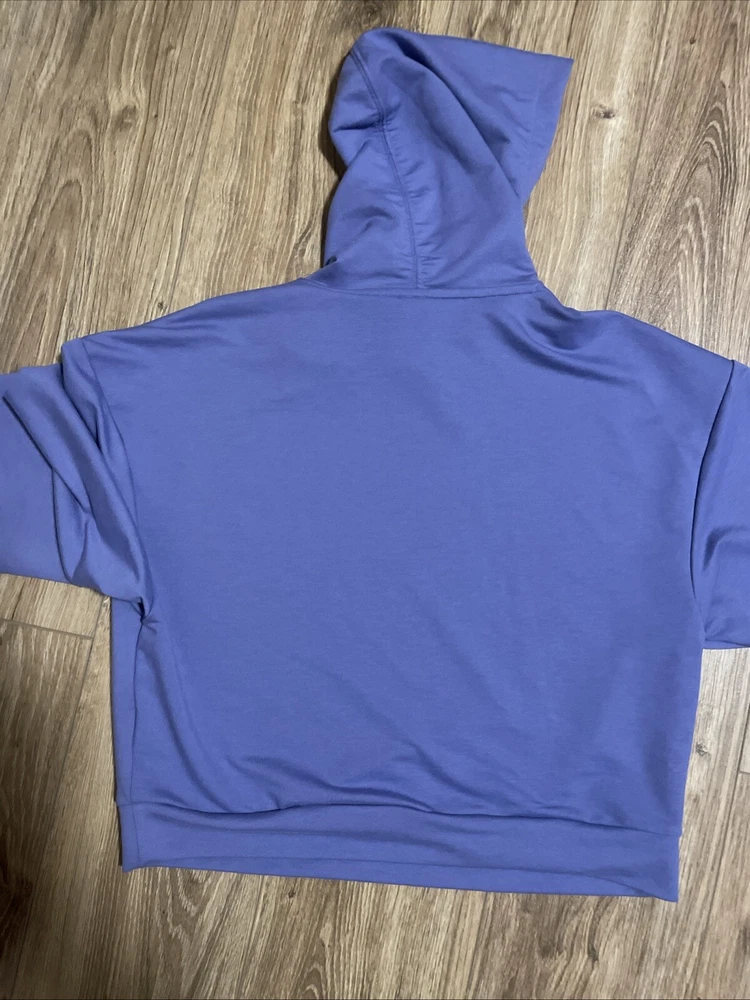 A stylish PUMA Women's Cropped Hoodie in size M, beautiful lavender color. Perfect for all seasons, this modern hoodie is suitable for various activities like gym training, walking, and running. Excellent preowned condition, like new.