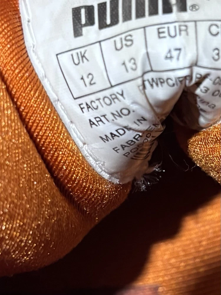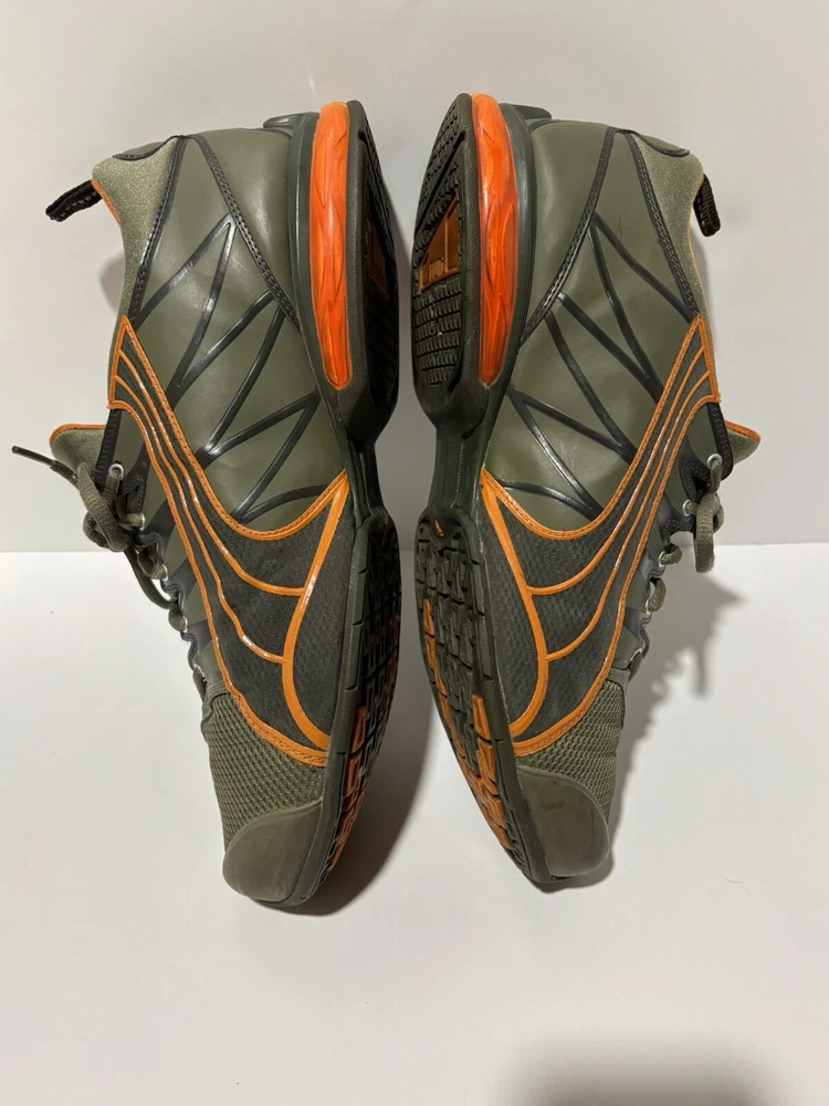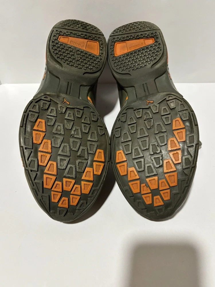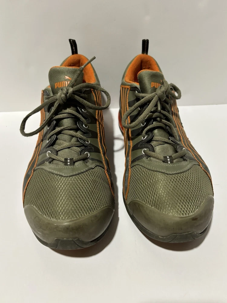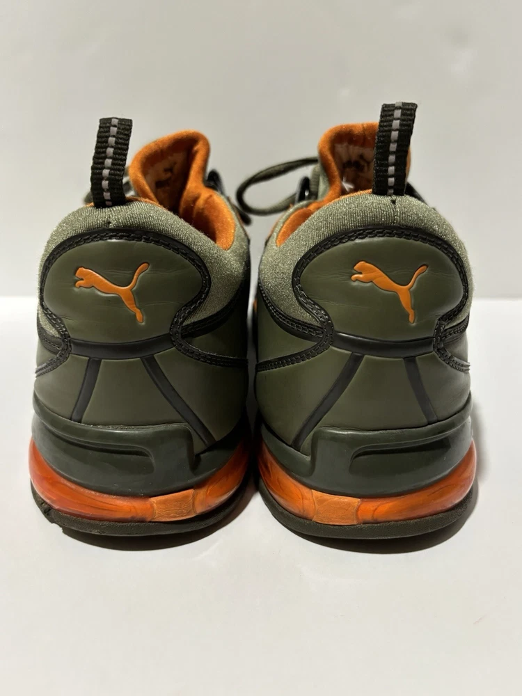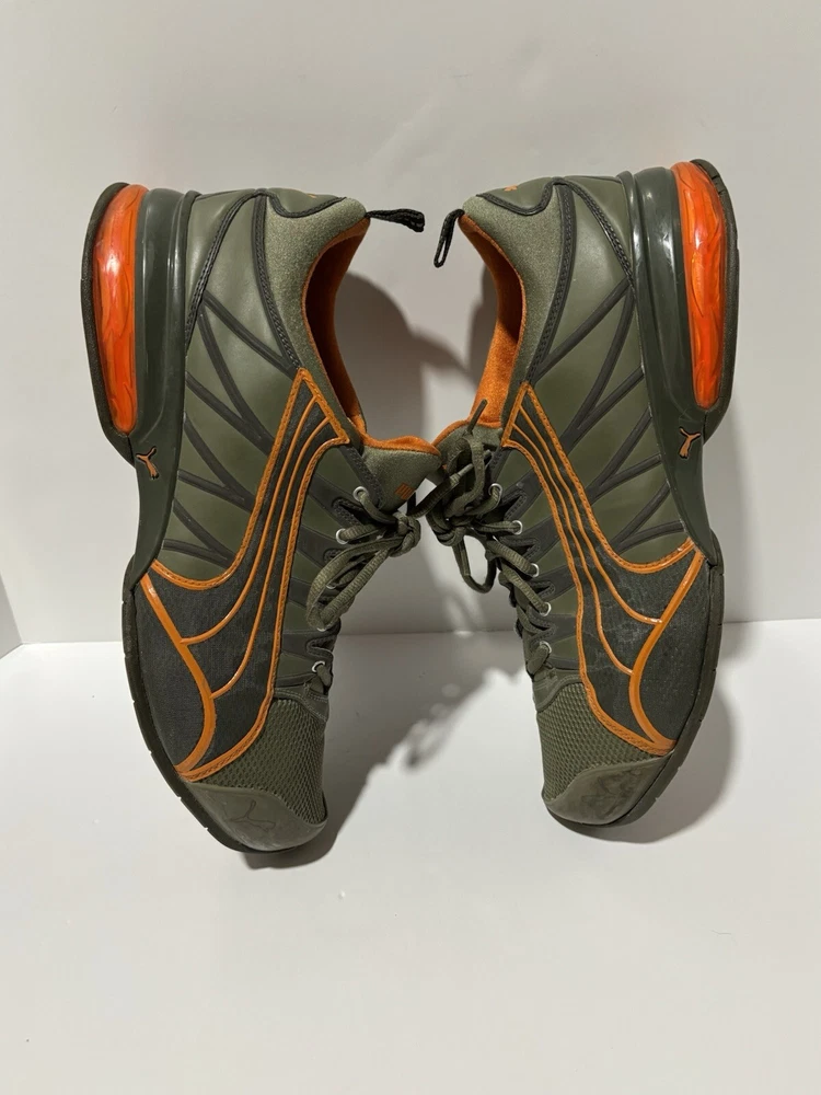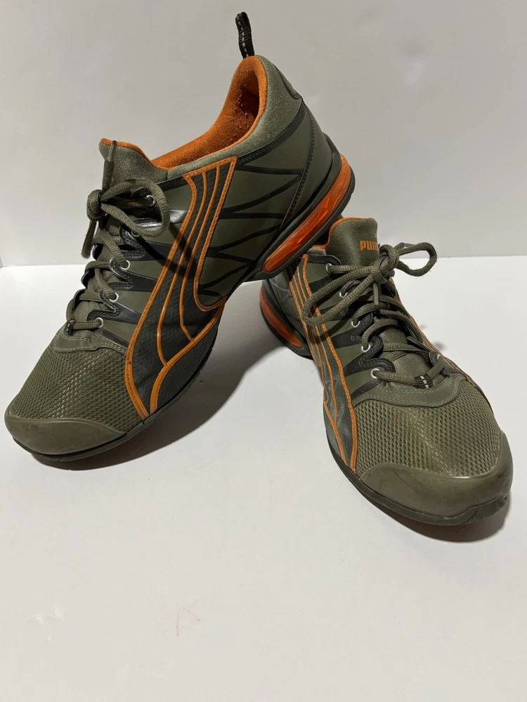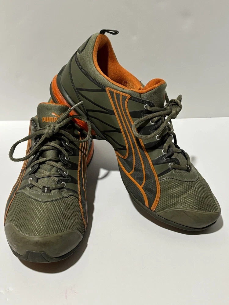 Step up your game with these PUMA Voltaic sneakers, designed for the active man who appreciates both style and comfort. In a striking army green with vibrant orange accents, these size 13 athletic shoes are tailored for gym training and running enthusiasts. The breathable mesh upper material and fabric lining ensure your feet stay cool and comfortable, while the durable rubber outsole provides excellent grip on a variety of surfaces. With a classic low-top sneaker silhouette, these shoes offer a versatile look that transitions smoothly from activewear to casual outings. Equipped with a foam insole and a standard shoe width, they're crafted to offer maximum comfort for all-day wear. Whether you're hitting the pavement or the treadmill, these PUMA sneakers are built to keep pace with your active lifestyle. The sneakers are preowned and are in good condition. Unable to determine the full model specs based on the tag.