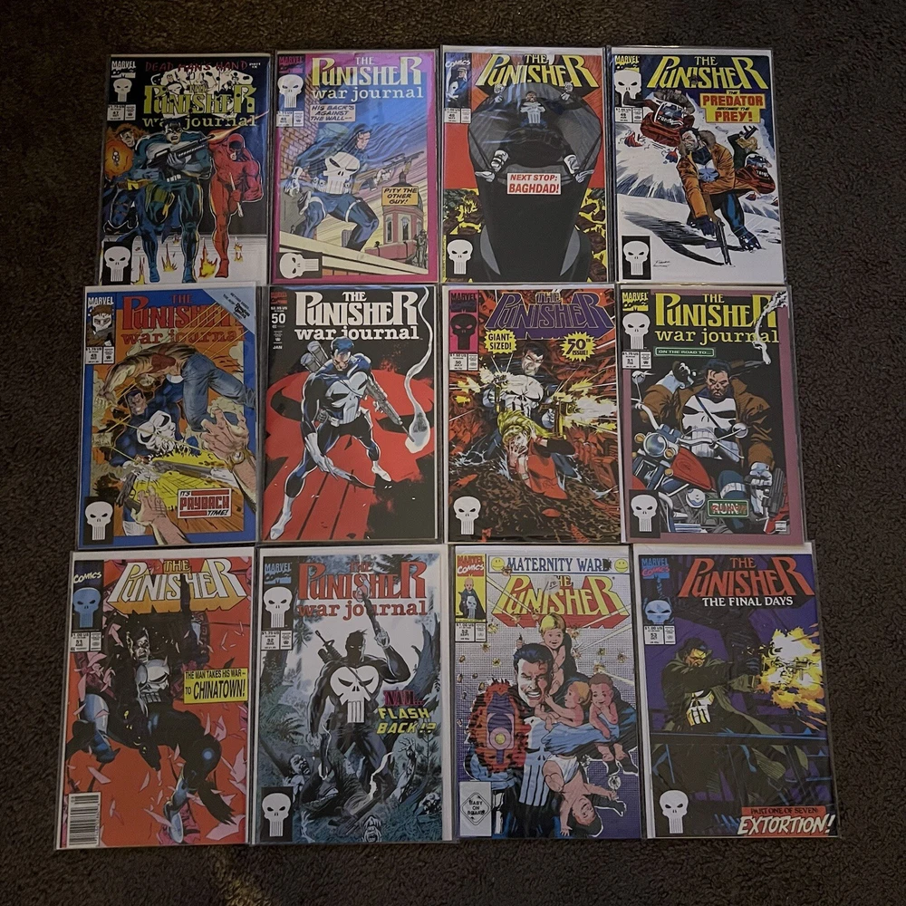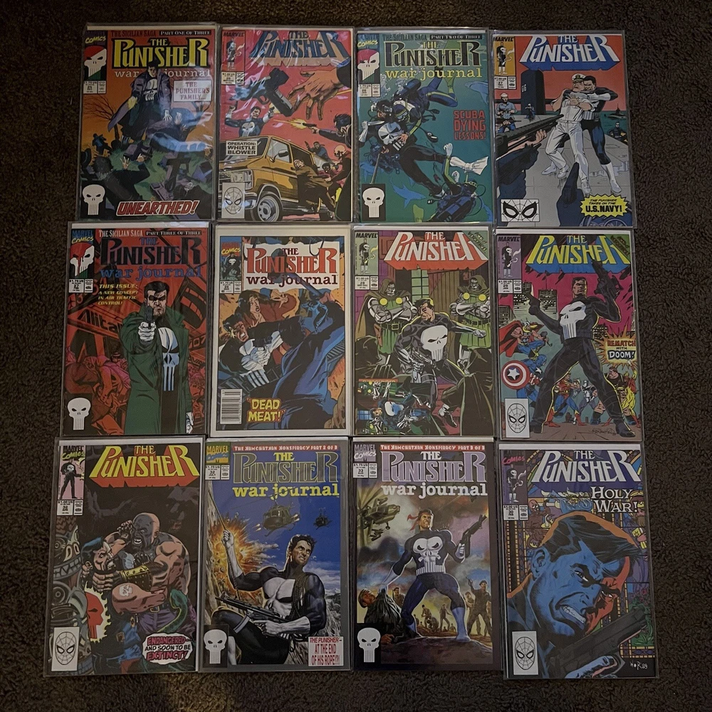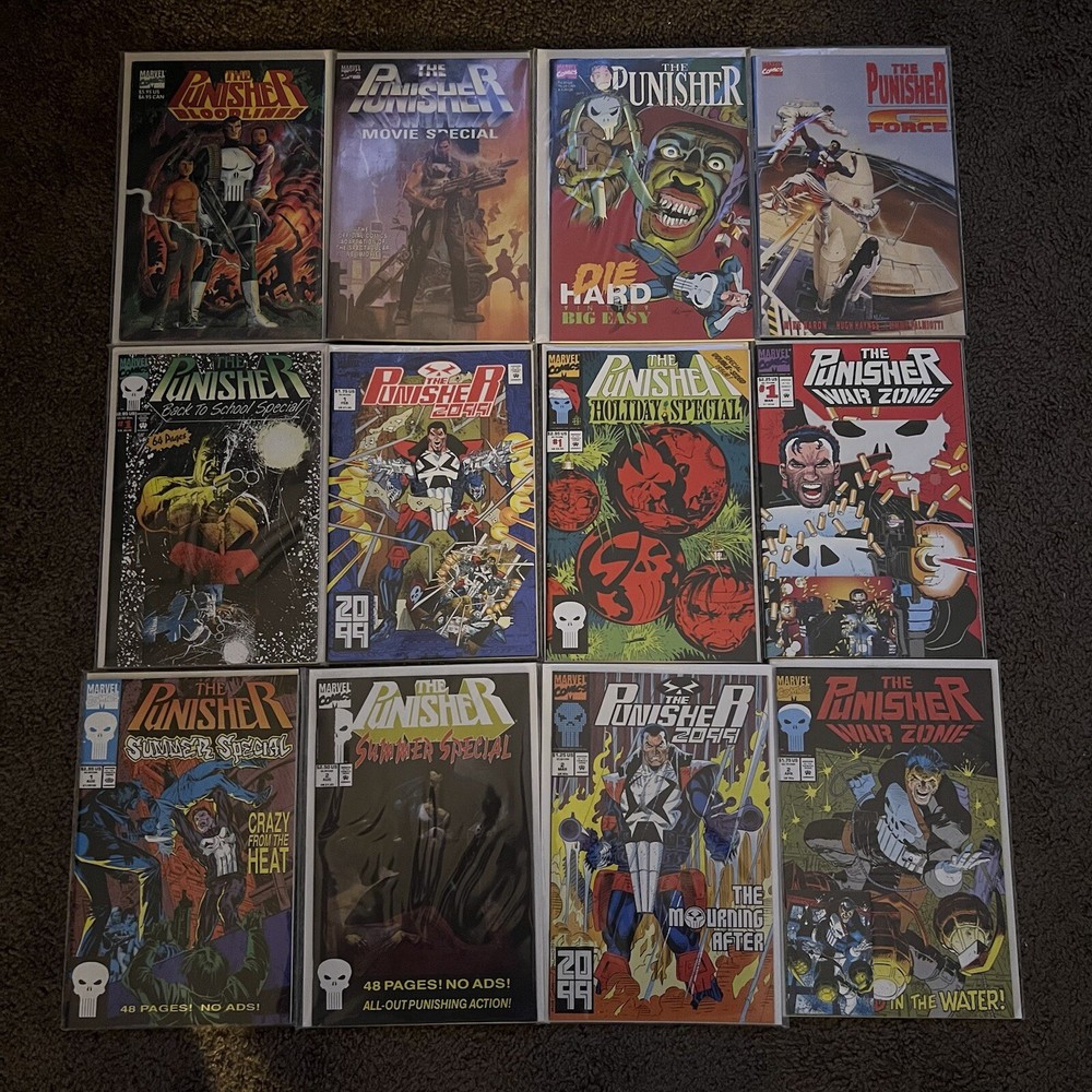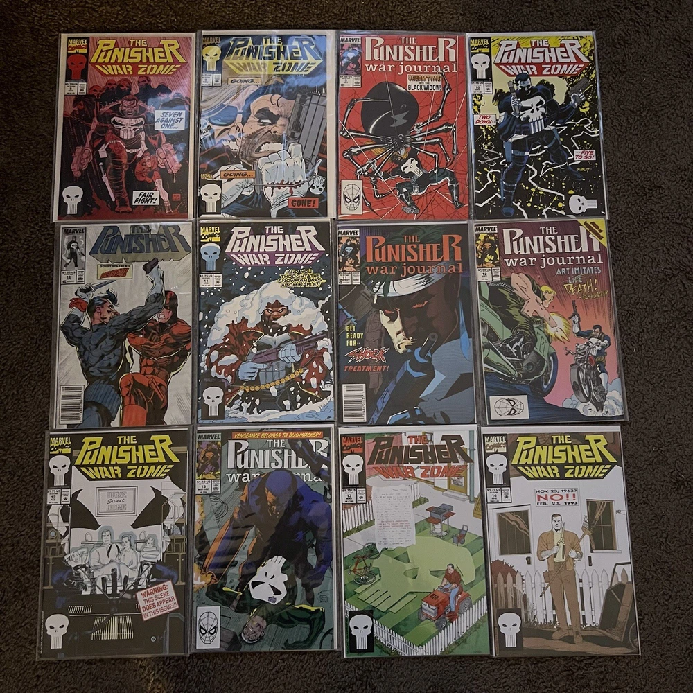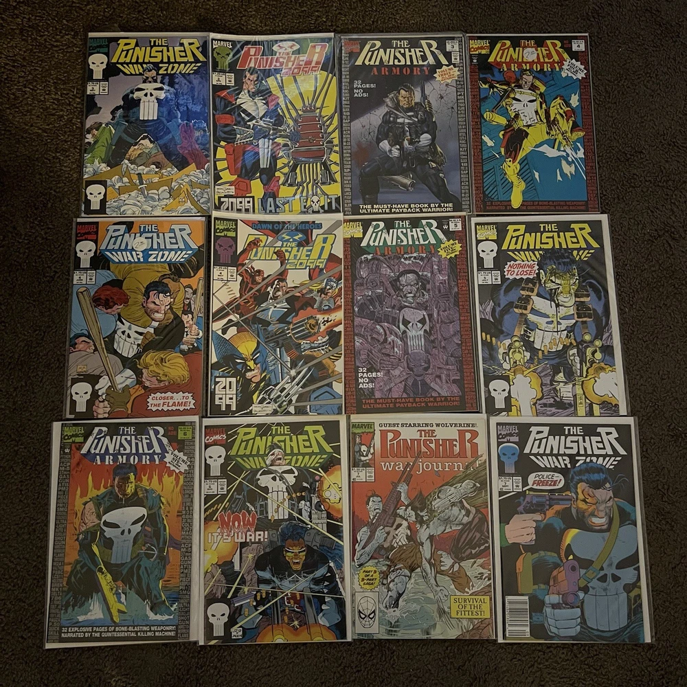 PUNISHER 121 COMIC LOT | WAR ZONE | WAR JOURNAL | 2099 | MARVEL COMICS LOT 121 COMICS - NO DUPLICATES! ALL COMICS HAVE CARD BACKING & DUST SLEEVES! GREAT CONDITION AND CLEAN! INCLUDES COMIC STORAGE BOX! Fearing a total of 121 individual Punisher comics this lot is an impressive start to anybody’s comic collection, or a way to add new additions to your current collection! Dive into the gritty world of the Punisher with this comprehensive comic book lot, featuring issues from the iconic 'Punisher War Zone' and 'Punisher War Journal' series. Each book is a testament to the Marvel Universe's Modern Age era, presenting thrilling crime and thriller narratives that showcase the Punisher's relentless anti-heroic actions.