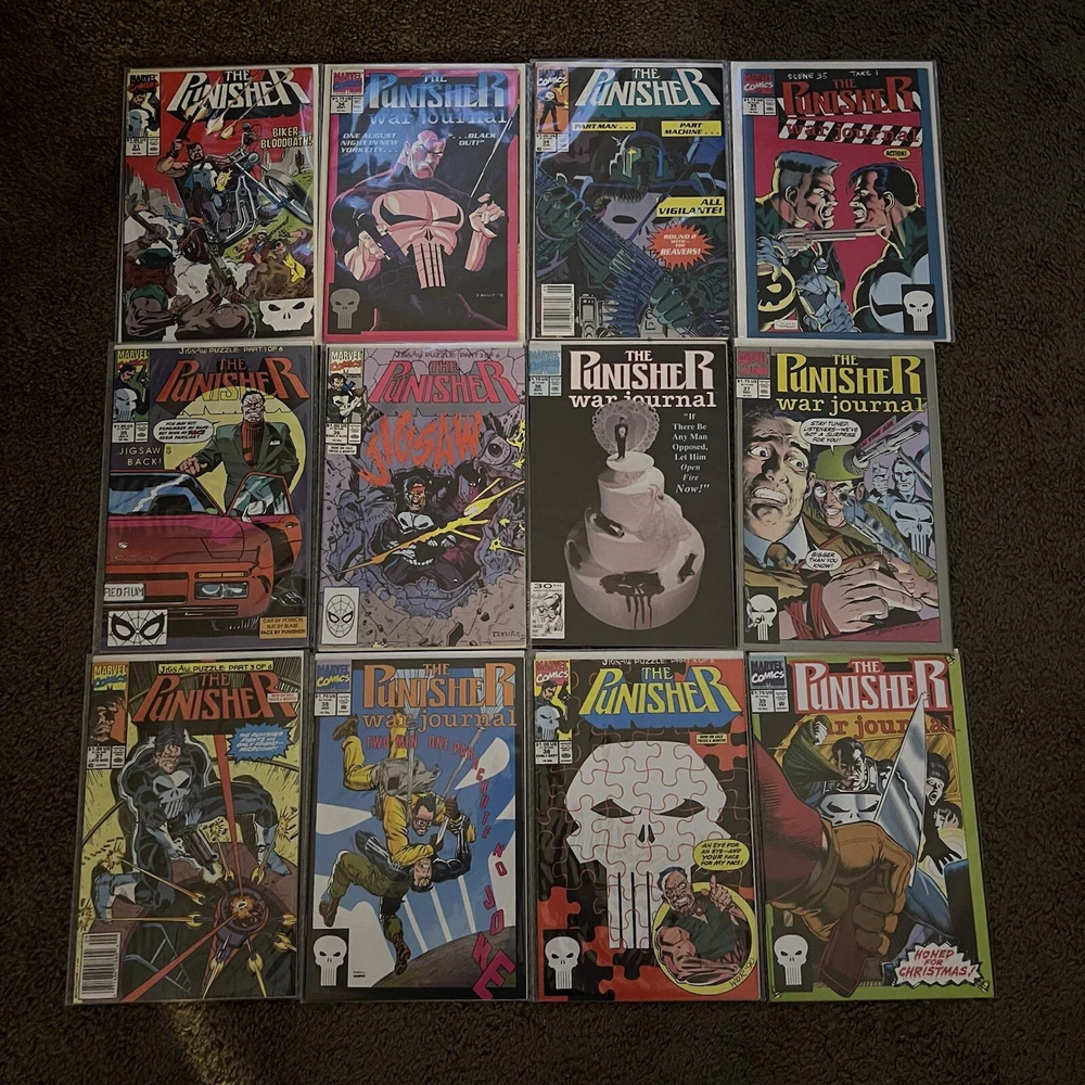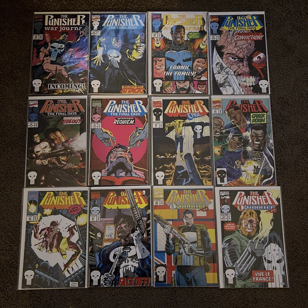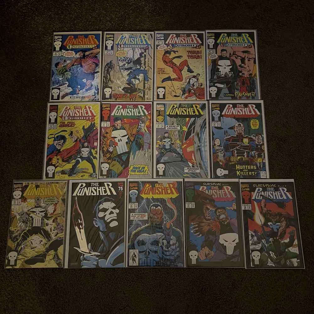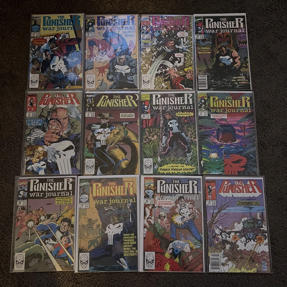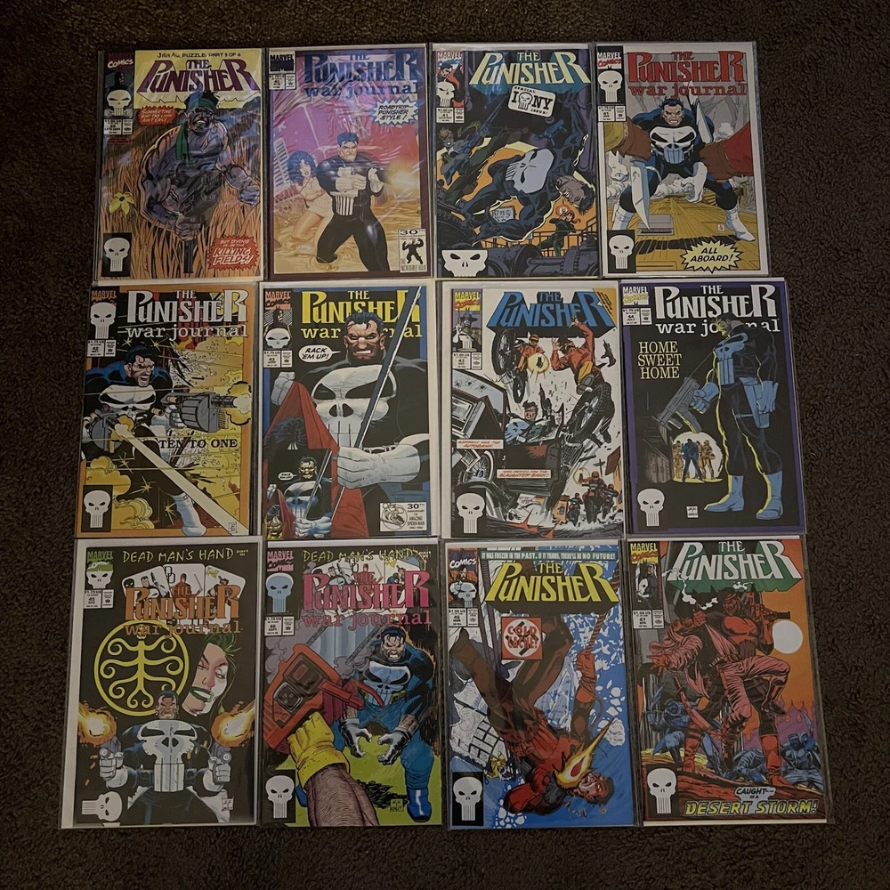 PUNISHER 121 COMIC LOT | WAR ZONE | WAR JOURNAL | 2099 | MARVEL COMICS LOT 121 COMICS - NO DUPLICATES! ALL COMICS HAVE CARD BACKING & DUST SLEEVES! GREAT CONDITION AND CLEAN! INCLUDES COMIC STORAGE BOX! Fearing a total of 121 individual Punisher comics this lot is an impressive start to anybody’s comic collection, or a way to add new additions to your current collection! Dive into the gritty world of the Punisher with this comprehensive comic book lot, featuring issues from the iconic 'Punisher War Zone' and 'Punisher War Journal' series. Each book is a testament to the Marvel Universe's Modern Age era, presenting thrilling crime and thriller narratives that showcase the Punisher's relentless anti-heroic actions.