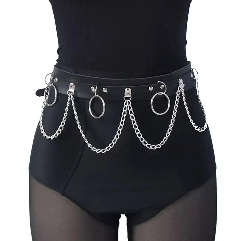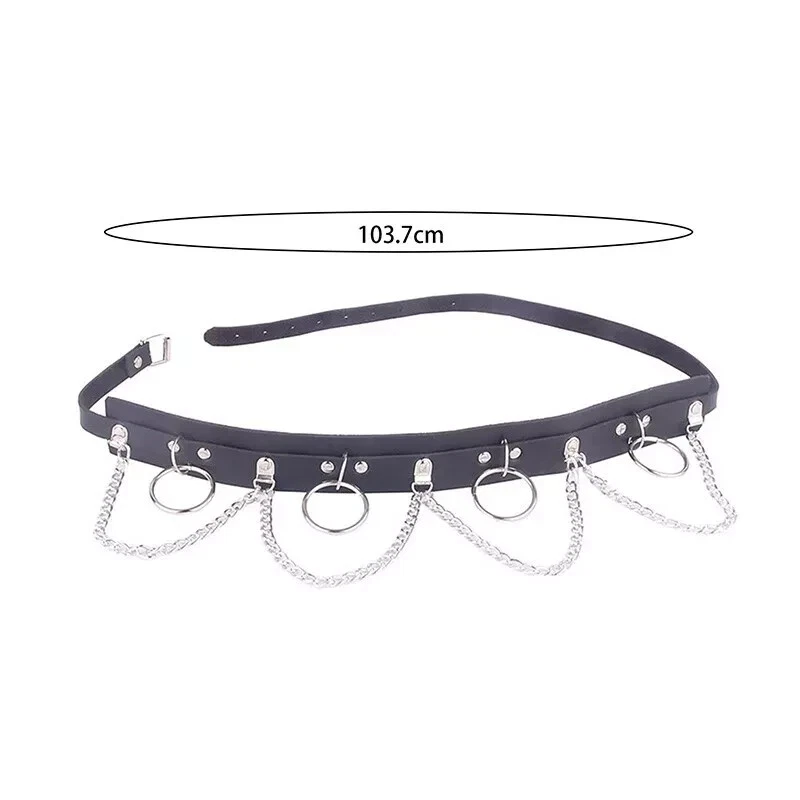 PUNK FAUX LEATHER BELT GOTHIC WAIST STRAP WITH METAL CHAIN & RING HARNESS