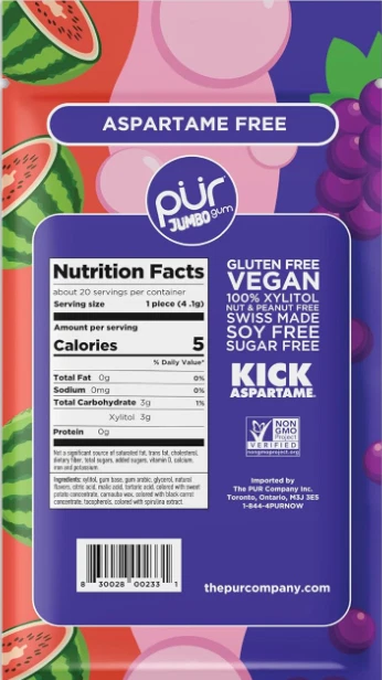 PUR Jumbo Gum | Aspartame Free Chewing Gum | 100% Xylitol | Natural Bubblegum, Grape, Watermelon Flavor, 20 Pieces About this item · NATURALLY DELICIOUS BIG FRUITY FLAVOR: Your favorite childhood gum, but better! Mouth watering natural bubblegum, grape, and watermelon flavors that are sure to be an easy addiction. Comes in a resealable bag. · 3X BIGGER: Experience the satisfying chew with our larger piece gum! Each generously sized piece offers an unparalleled chewing experience, allowing you to savor the taste. Elevate your gum experience with JUMBO's larger pieces - more flavor, more satisfaction! · KICK ASPARTAME: Aspartame free & Sugar free gum that is naturally sweetened with 100% xylitol. Xylitol is an all-natural sugar alcohol that looks and tastes just like sugar, yet has 40% fewer calories. · ALLERGEN FREE GUM: PUR Gum is made just for you. We are Vegan, Aspartame Free, Non-GMO, Sugar Free, Gluten Free, Soy Free, Nut & Peanut Free, Keto Friendly, and Swiss Made. · OUR MISSION: PUR creates products with the highest quality ingredients to help you make simple substitutions so that your everyday decisions to live a healthier lifestyle are effortless. Product Description: JUMBO : This sugar free gum has a fruity bubblegum, grape, and watermelon flavors. Each piece of Jumbo gum is 3x the size of a regular chiclet! Each resealable bag of Jumbo gum contains 20 pieces. Our Story : Founded in 2010, PUR was built on the founding principle of making simple substitutions to promote a healthier lifestyle, without compromising taste or quality! With a growing number of dietary restrictions and health-conscious consumers, PUR set out to create products that everyone could safely consume, enjoy, and share! Naturally Sweetened with 100% Xylitol : PUR uses sustainably sourced xylitol. It looks & tastes just like sugar with 40% less calories than sugar while boosting oral health. Try PUR : Taste our New PUR Popcorn, New PUR Mints, PUR Gum & PUR Blister Gum!