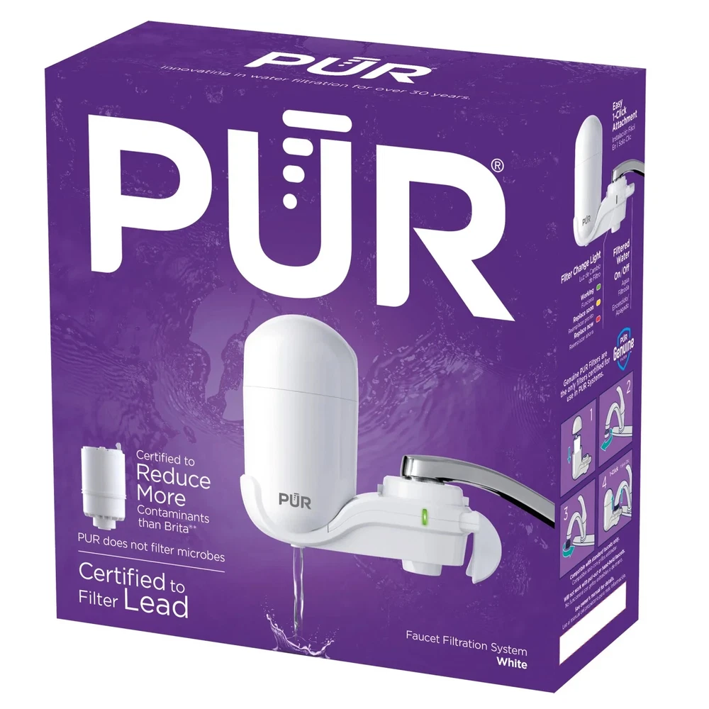 Certified to reduce 10x more chemical & physical substance removal than Brita’s leading pitcher filter.* The only faucet filter certified to reduce 70 contaminants including lead and microplastics. § Trusted for over 35 years, PUR is the #1 selling brand in faucet filtration.‡ Hassle-free, 1-click design that doesn't require any tools to install. Compatible with standard faucets. Not for use with pull-out or hand-held faucets. Filter Change Light so you know when to change your Genuine PUR filter. Provides filtered better-tasting water on demand with an easy on/off switch. Superior filtration that can save you up to $30 per week.† Includes 1 PUR Faucet System and 1 Genuine PUR Filter for 2-in-1 powerful filtration.