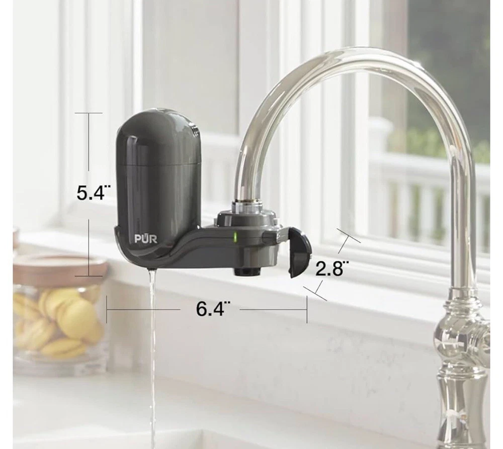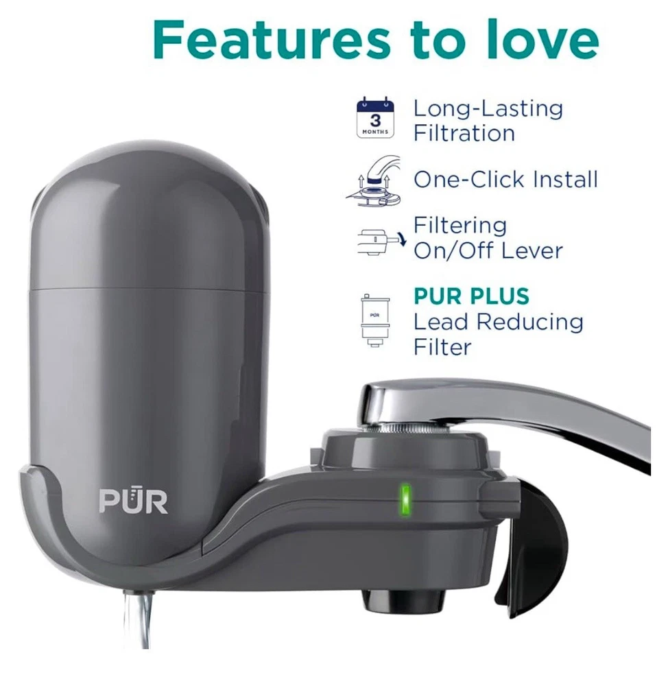 PUR PLUS Vertical Faucet Mount Water Filtration System with 3-in-1 Lead Reducing Filter for Great-Tasting Filtered Tap Water, Lasts 100 Gallons, Fits Most Kitchen or Bathroom Faucets, Grey
