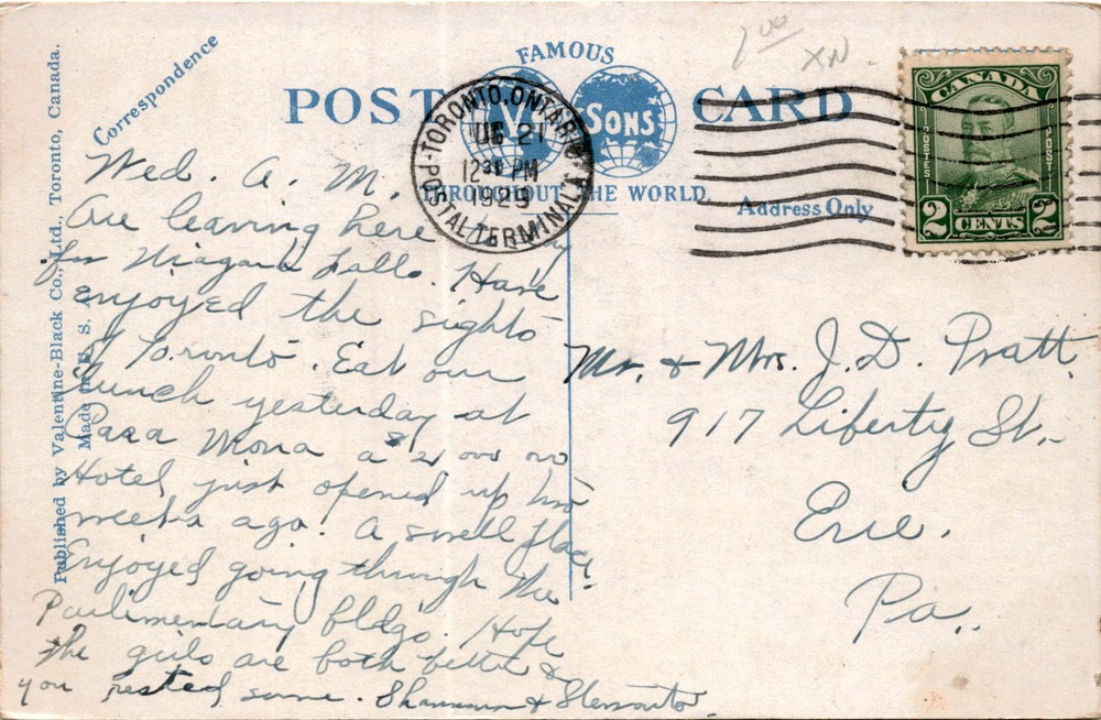 MAKE AN OFFER. THE MORE YOU BUY THE BETTER DEAL I WILL ACCEPT The postcard features an image of the Pure Food and International Building at the Canadian National Exhibition in Toronto, Canada. The text on the postcard mentions the enjoyment of the exhibition in Toronto and plans to visit Niagara Falls. It also refers to a new hotel on Liberty Street, the Parliament building, and the sender's location in Erie, Pennsylvania.