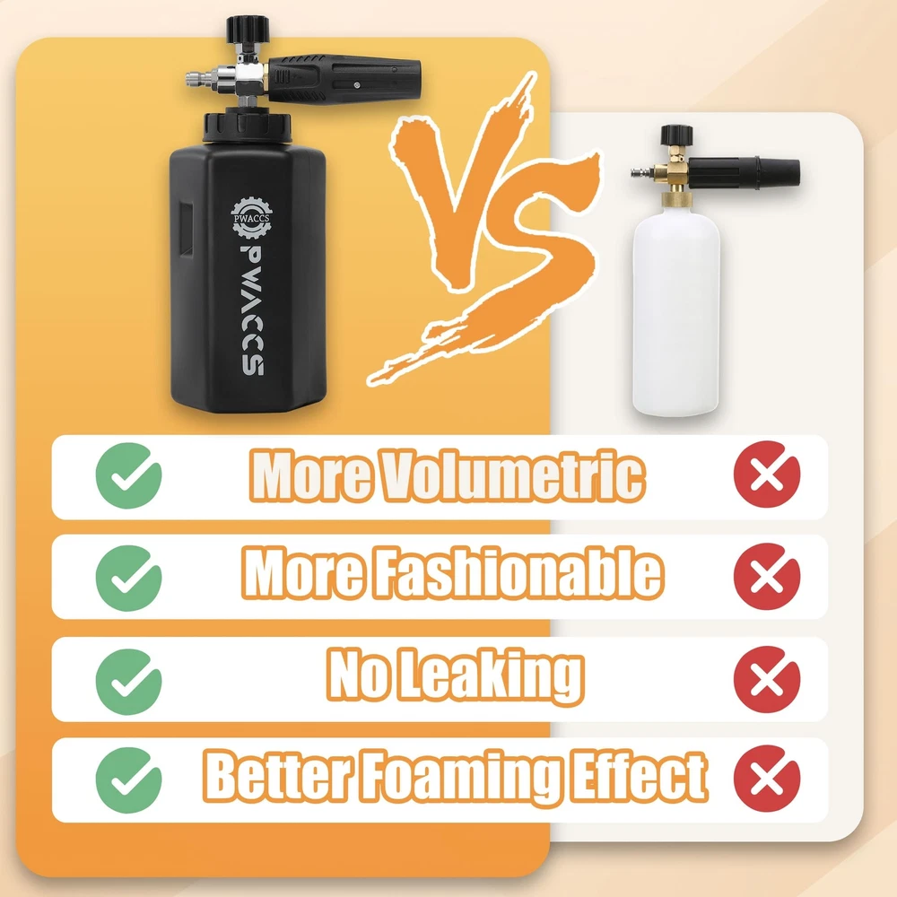 PWACCS Pressure Washer Gun with Foam Cannon, Short Pressure Washer Gun with Swivel, Foam Cannon for Car Wash Foam Gun Kit with 1/4" Quick Connector, 5 Pressure Washer Nozzle Tips, 1.5 Liter, 5000 PSI Product Details Style: Foam Gun Brand: PWACCS MPN: PC46 UPC: Does not apply EAN: Does not apply Product Dimensions: 5 x 9 x 7 inches Item Weight: 3.6 pounds Manufacturer: PWACCS Country of Origin: China Item model number: PC46 DENSE & THICK FOAM - The heavy-duty foam core of the pressure washer foam cannon creates a dense and thick, snow-like foam that clings to the car's surface, resulting in thorough and effective cleaning in all areas. Effortlessly remove dirt and grime from your vehicle. Achieve professional-level cleaning results with specially designed foam cannon kit. KINK-FREE SWIVEL - Pressure washer short gun kit is equipped with a swivel 3/8" NPT adapter that allows your pressure washer hose to rotate freely, preventing kinks and making it easier to use without wrestling with the hose, saving your time during cleaning tasks. MATERIAL UPGRADE - Pressure washer car wash kit is made of high-quality stainless steel and silicone material, which is strong and durable, and can work at MAX 5000 PSI normally, Max temperature for water is up to 150C ( 300F). The wide neck foam blaster is equipped with a stainless steel filter, which ensures a leak-proof seal. ADJUSTABLE FOAM SPRAYER - The adjustable nozzle ensures the ideal spray pattern, while the water regulator knob controls water and foam mix. The nozzle holder rotates 360 degrees to tweak the direction. Snow foam cannon makes car washing faster, reducing the amount of time and effort required for cleaning. GREAT COMPATIBILITY - The universal power washer foam gun is compatible with a 3/8" NPT adapter, additionally equipped with three types of connectors: M22-14mm, M22-15mm fittings, and 3/8" quick connector. They are available for different sizes of pressure washer hoses, compatible with most high-pressure washer models. PROFESSIONAL CHOICE - Big-mouth pressure washer foam gun is perfect for cleaning cars, roofs, driveways, siding, floors, windows, trucks, and SUVs. Whether you are a professional cleaner or a homeowner looking to clean your house or car, our snow foam lance is an essential cleaning tool.