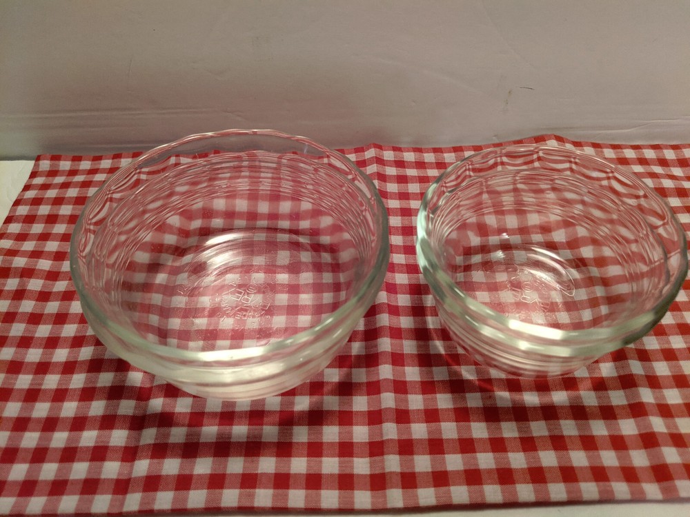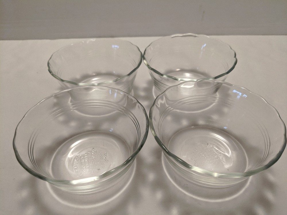 vintage PYREX CUSTARD CUP SET Ad is for 4 cups. 2 - 6 ounces each 2 - 10 ounces each Comfortably hold about 1/2 to 1 cup of ice cream, pudding, dessert, etc. Also handy for holding measured out ingredients while baking or cooking. These cups are the older and thinner type with scalloped edge and 3-ring design around outside. Good shape Clean Ready to use