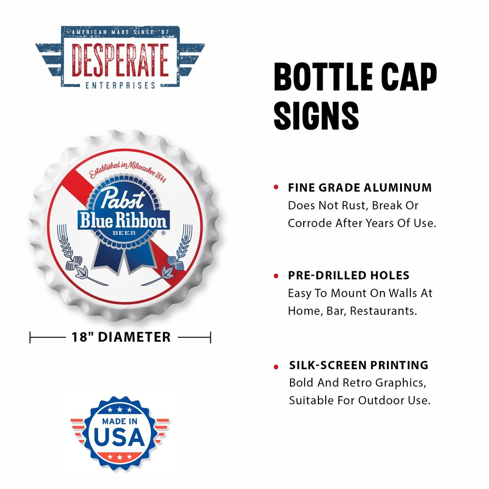 Aluminum Sign Details: Size is 18" diameter round x 2.5" deep. Crafted from aluminum and manufactured with pre-drilled holes for easy hanging, this makes them convenient for display on walls, doors, fences, or other surfaces. Versatile and Eco-Friendly: Aluminum signs can be used for various purposes, including home decor, bar decorations, garage or man cave adornments, restaurant themes, and as gifts for vintage enthusiasts. Aluminum is a recyclable material, making aluminum signs an environmentally friendly option for sustainable signage solutions. Professional Appearance and High-quality Graphics: Printed using UV resistant digital printing which ensures high-quality graphics, vibrant colors, and sharp images. Aluminum signs have a clean and professional appearance that is suitable for both commercial and residential settings. Indoor and Outdoor Use: Aluminum is highly resistant to rust, corrosion, and weather elements, making it suitable for long-term outdoor use. These signs can withstand harsh weather conditions, including rain, sunlight, and extreme temperatures. Made in America: Proudly manufactured in the USA. Family owned and operated since 1987.
